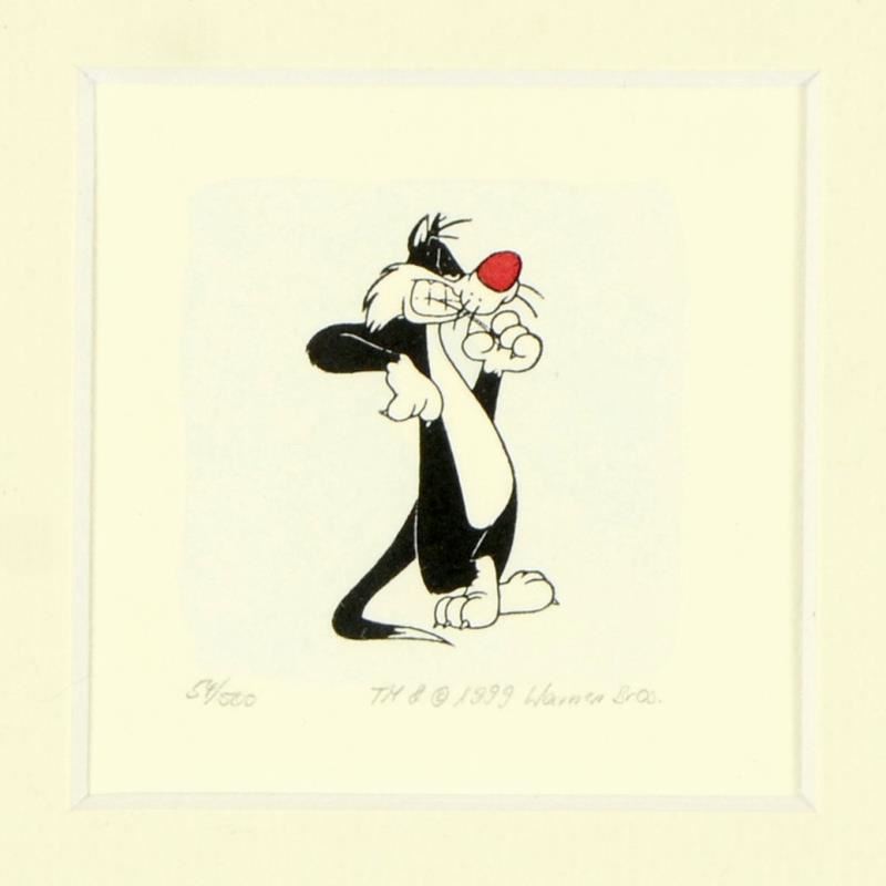 "Sylvester" is a limited edition etching on paper with hand-tinted coloring from Warner Bros, numbered and dated 1999. This piece comes framed. Measures approx. 9" x 9" (with frame), 2" x 2" (image).
