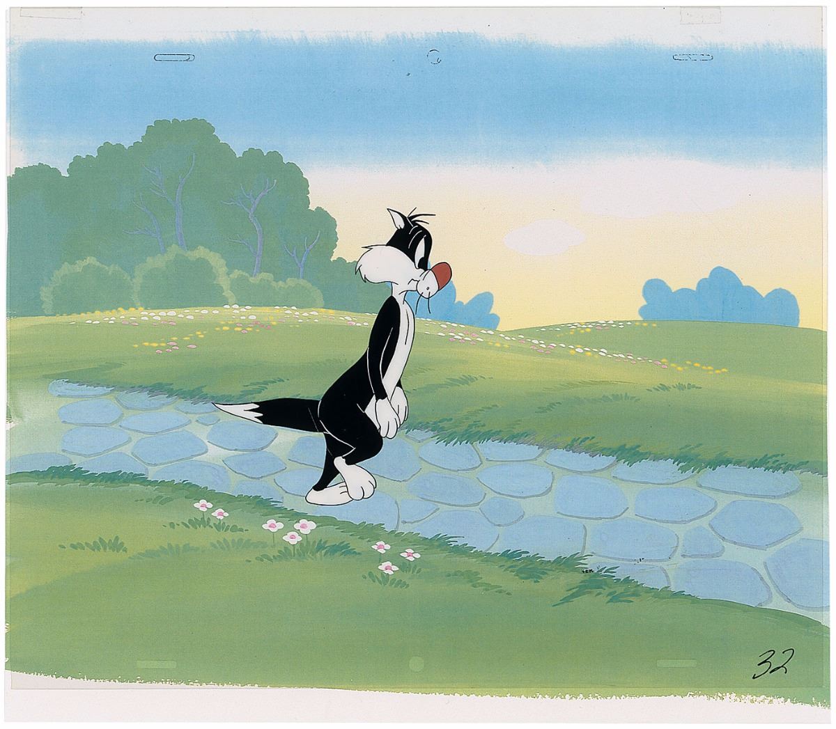(Warner Brothers Studios, circa 1950s) Original production cel featuring Sylvester in a full-length upright pose. The cel is placed on a color copy background. Image measures 3.5 x 4.75, with overall dimensions of 12.5 x 11. In fine condition.
