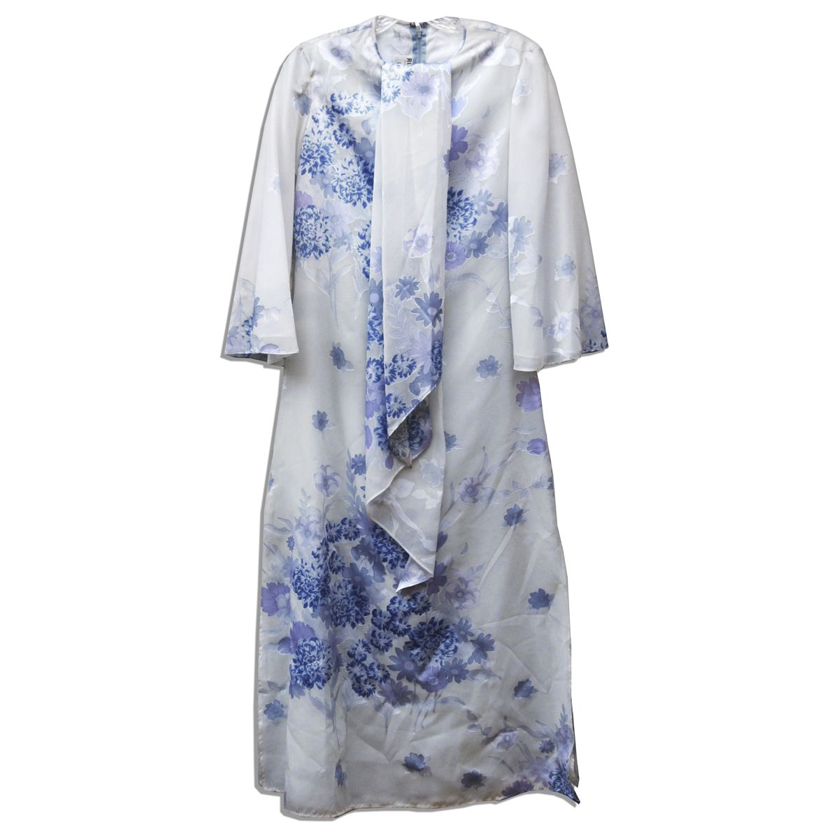 Sylvia Miles worn dress from 1989 film ''She Devil''. Miles starred in the dark comedy as Meryl Streep's mother. Gown is made of white chiffon with applied floral design in blue and lavender, with matching sash. A Rizkallah label is sewn in, with Miles' name handwritten on it. Some staining to lining, else near fine. From the Gene London Costume Collection.