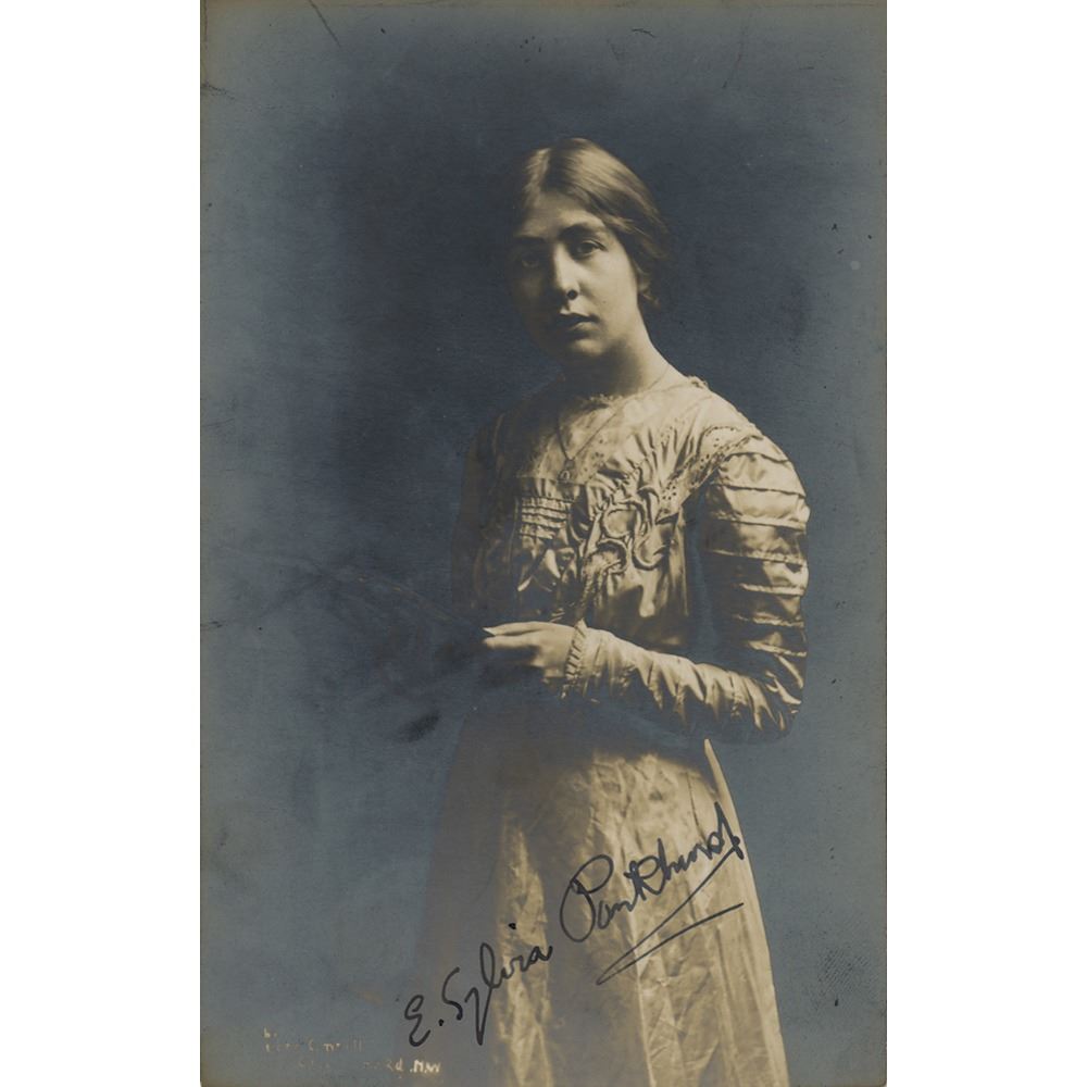 Suffragette, socialist, and anti-fascist activist (1882–1960) also remembered for her advocacy of an international auxiliary language. Vintage matte-finish 3.25 x 5.25 three-quarter-length photo of the suffragette, nicely signed in fountain pen, "E. Sylvia Pankhurst." In fine condition, with overall silvering to the dark areas of the image.