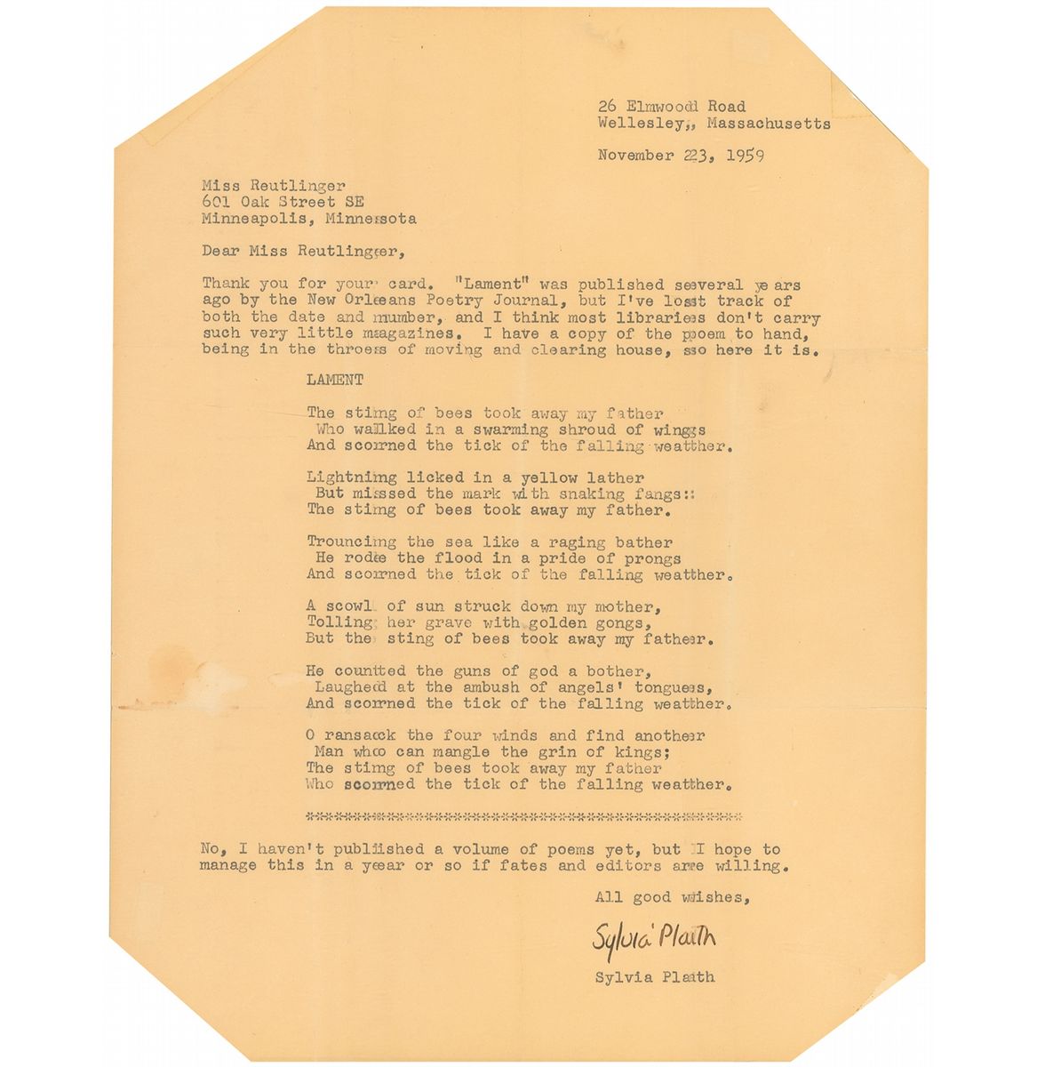 Plath’s ‘Lament’ is a villanelle, a traditional form of poetry that she often used during her college years. Its prevalent theme, the death of her father, is often found in her other work. Her father, Otto Plath, was a professor of biology and German at Boston University. As alluded to in the poem, he was an entomologist with an expertise on bees and wrote the book Bumblebees and Their Ways in 1934. In 1940, when Plath was only eight, he died of advanced diabetes. The trauma of his death is thought to have deeply influenced Plath's work and to have contributed to her later emotional problems. In this letter she presents the poem and hopes for a published volume of her poetry “if the fates and editors are willing.” They were, and her first collection of poetry, The Colossus and Other Poems, was published the following year. Anything signed by Plath is practically nonexistent and this is the first example we have ever offered. With its outstanding poetic content, it would make a superb addition to any literary collection.