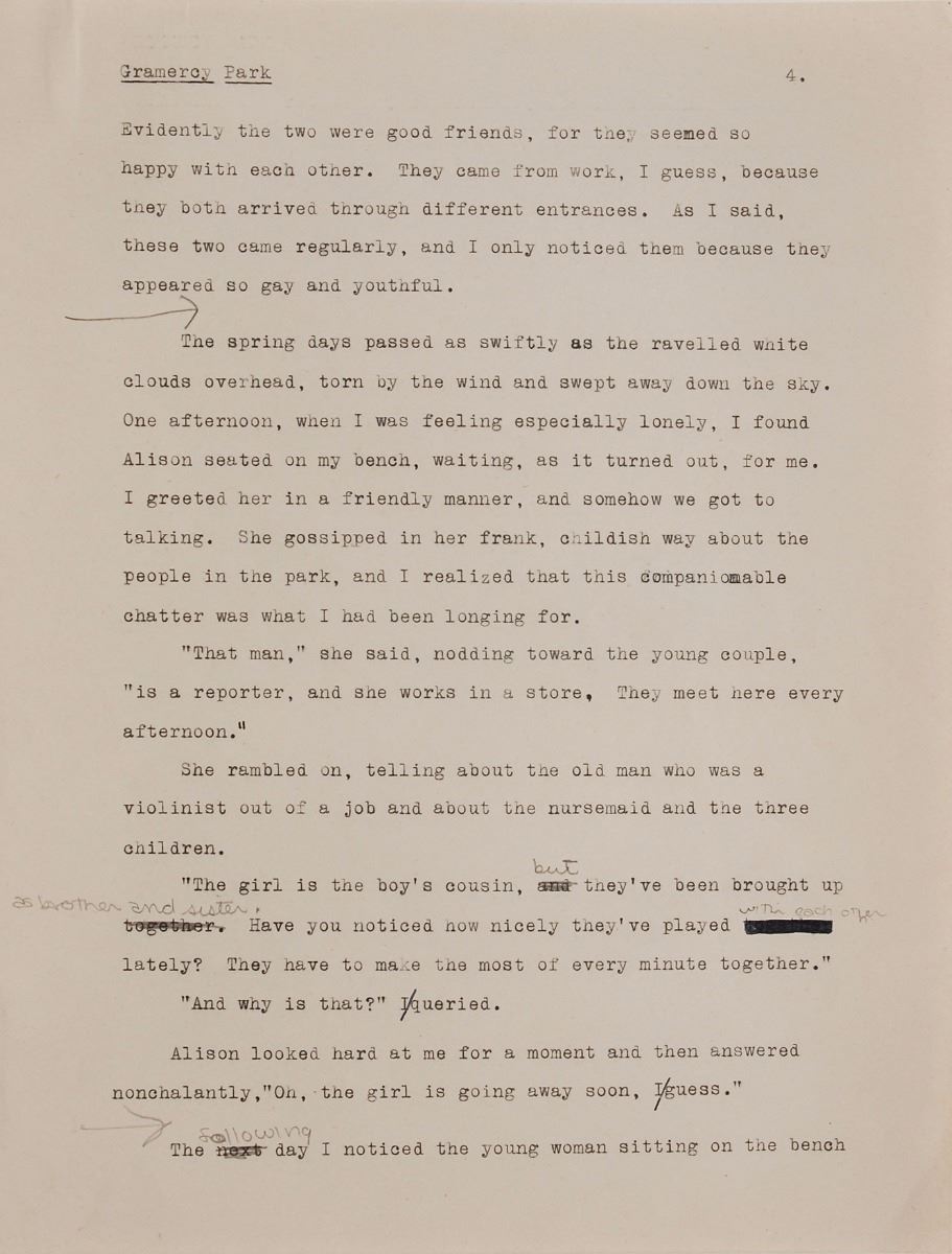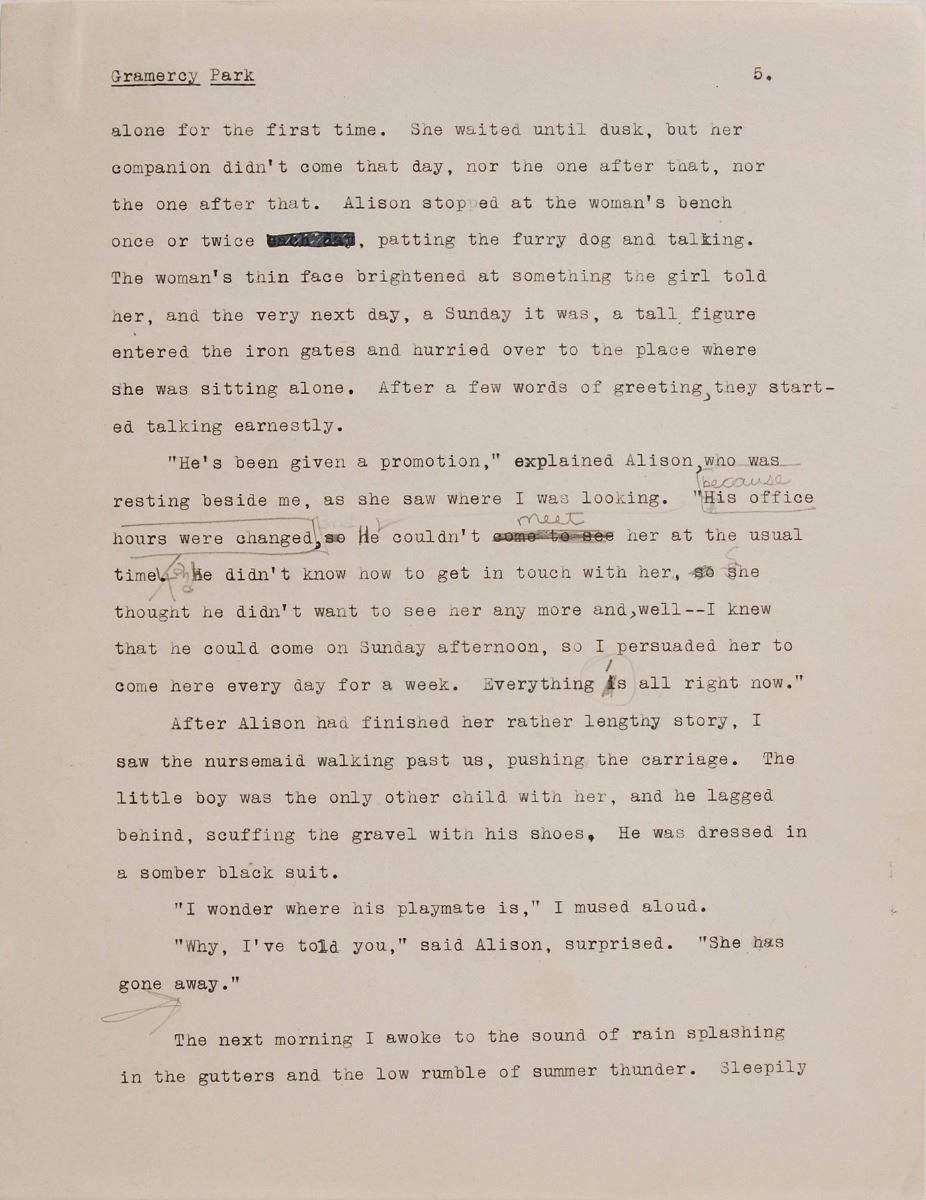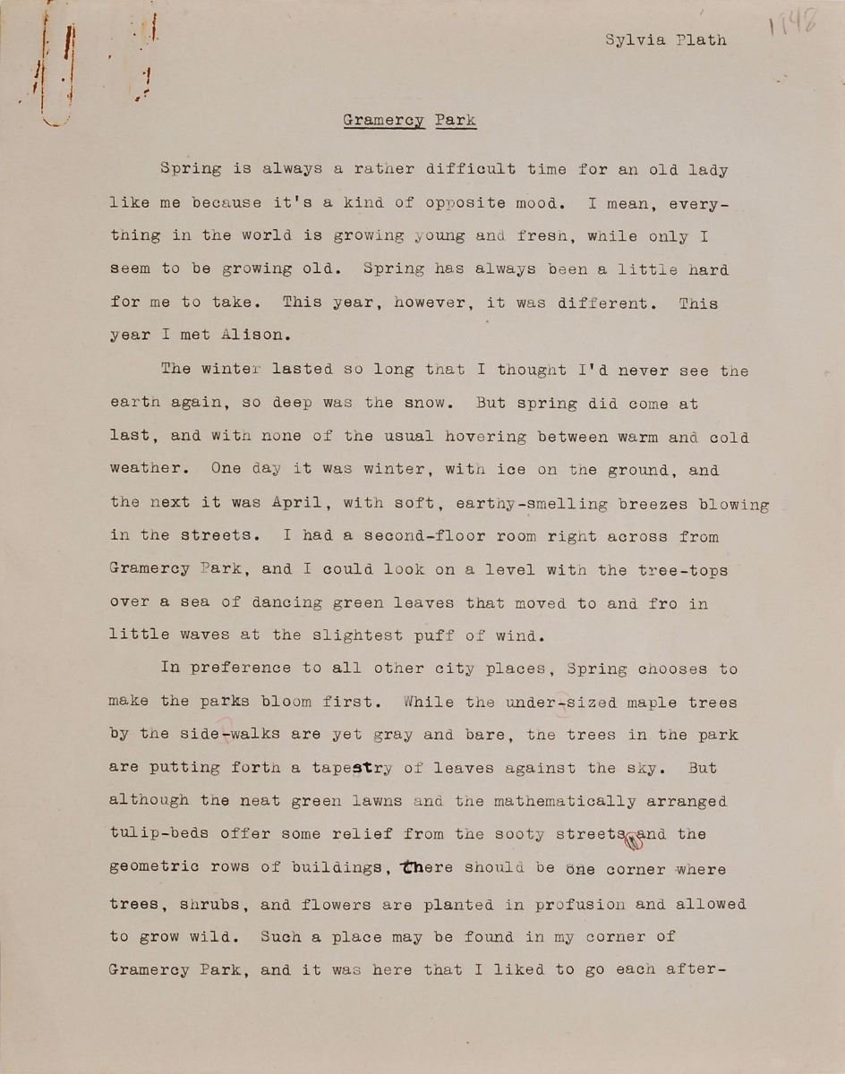 Hand-corrected typescript draft for the story "Gramercy Park," six pages, 8.5 x 11, dated 1948. The story begins, "Spring is always a rather difficult time for an old lady like me because it's a kind of opposite mood." Plath has made minor edits in ink and pencil throughout, with the fourth and fifth pages having the most significant revisions. A few editorial interventions in red pencil are also present. In fine condition, with rusty paperclip impressions to top left. Previously sold by Sotheby's as part of the Sylvia Plath estate in 1982.