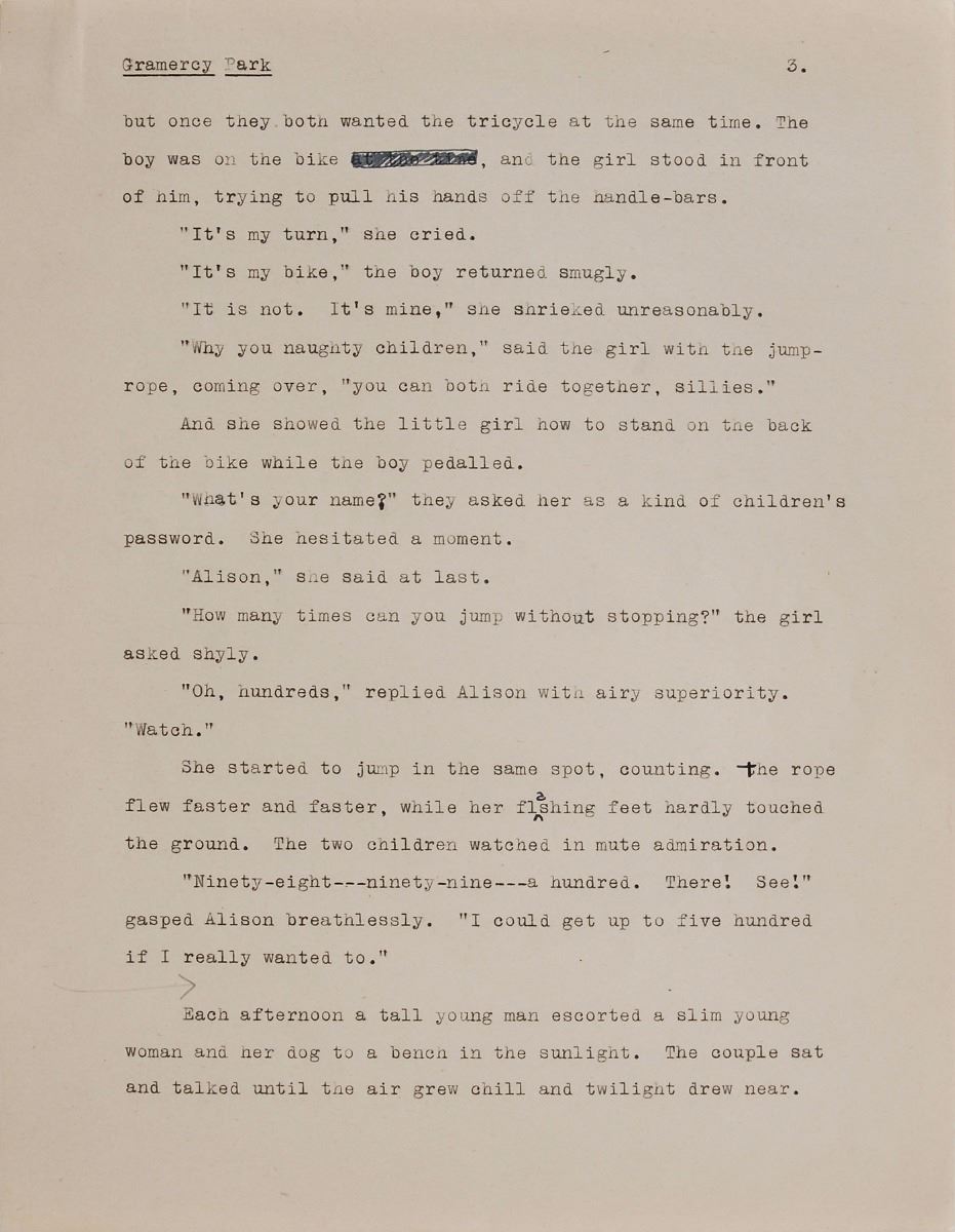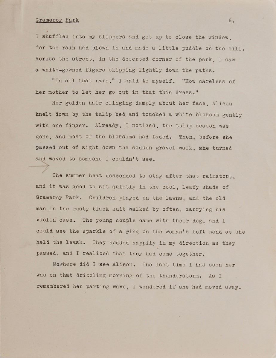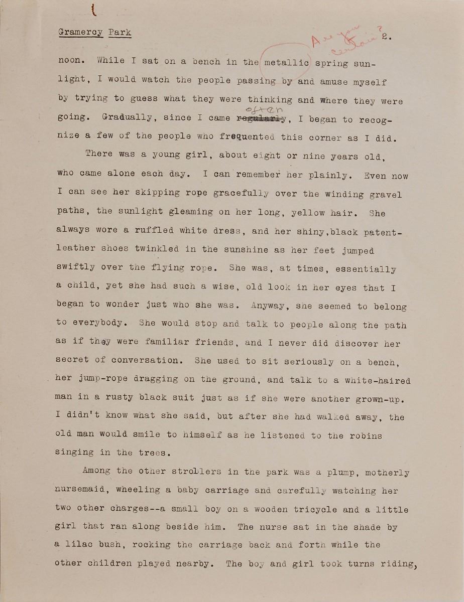 Hand-corrected typescript draft for the story "Gramercy Park," six pages, 8.5 x 11, dated 1948. The story begins, "Spring is always a rather difficult time for an old lady like me because it's a kind of opposite mood." Plath has made minor edits in ink and pencil throughout, with the fourth and fifth pages having the most significant revisions. A few editorial interventions in red pencil are also present. In fine condition, with rusty paperclip impressions to top left. Previously sold by Sotheby's as part of the Sylvia Plath estate in 1982.
