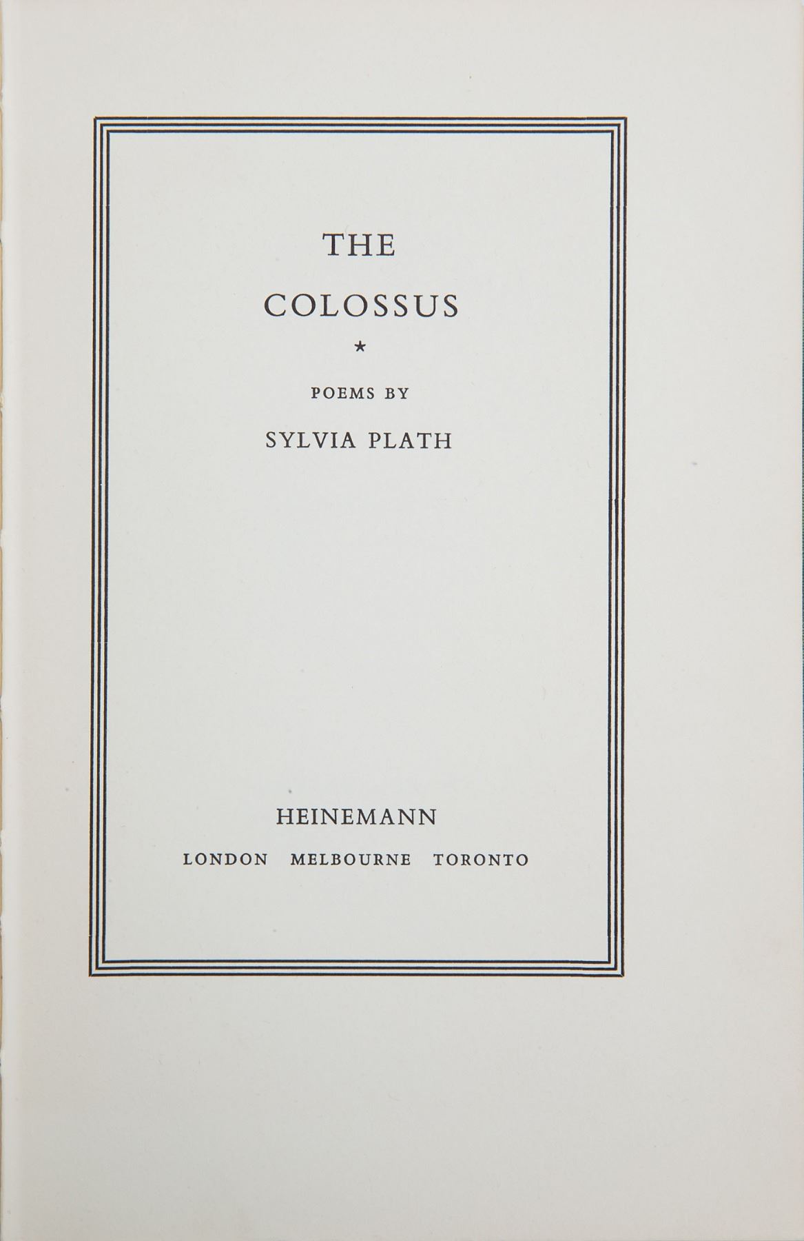 Unsigned first edition book: The Colossus by Sylvia Plath. First edition. London: William Heinemann Ltd, 1960. Hardcover, 5.75 x 8.75, 88 pages. Book condition: Very Good/None. As the only collection of Plath's poetry published before her death in 1963, this is a highly sought-after edition.