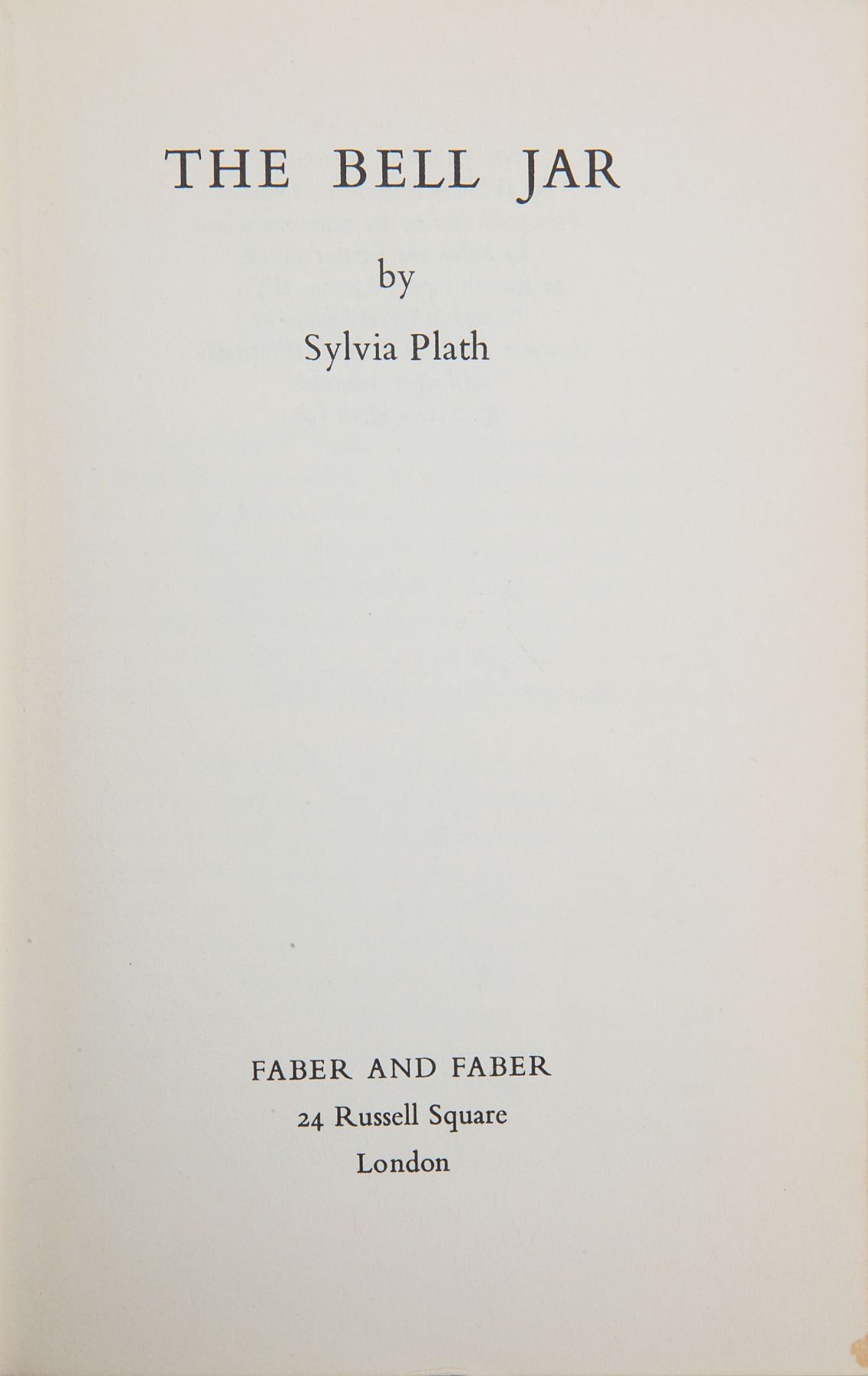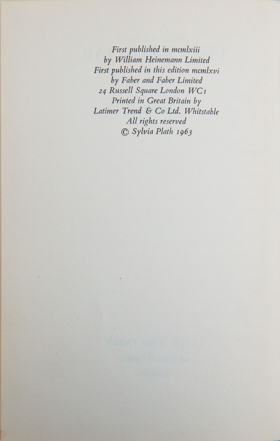 Unsigned first edition book: The Bell Jar by Sylvia Plath. First edition thus. London: Faber and Faber, 1966. Hardcover with dust jacket, 5.25 x 7.5, 258 pages. Book condition: Very Good+/Very Good. Plath's only novel, The Bell Jar, was originally published in 1963 under the pseudonym 'Victoria Lucas.' This is the first edition of the 1966 version published under her real name.