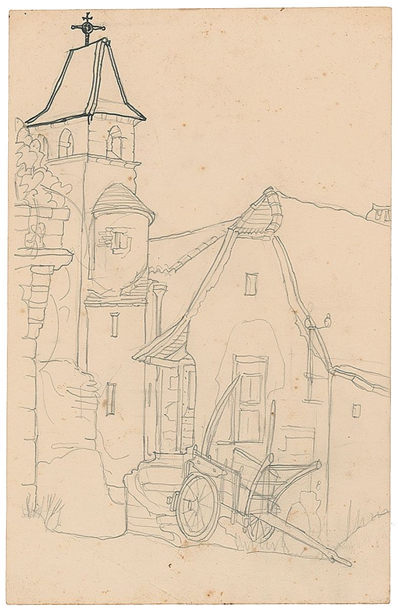 Poet, novelist and short story writer (1932–1963), who committed suicide after her separation from her husband and a long bout with depression. Original unsigned pencil sketch by Sylvia Plath of a rustic village on an off-white 5.5 x 8.5 sheet, identified on the reverse in pencil by her husband, "by Sylvia Plath, Ted Hughes." In fine condition, with scattered light foxing. Plath was an accomplished artist, who developed what she called 'a kind of primitive style of my own which I am very fond of.' A major retrospective of her drawings took place in London in 2011.