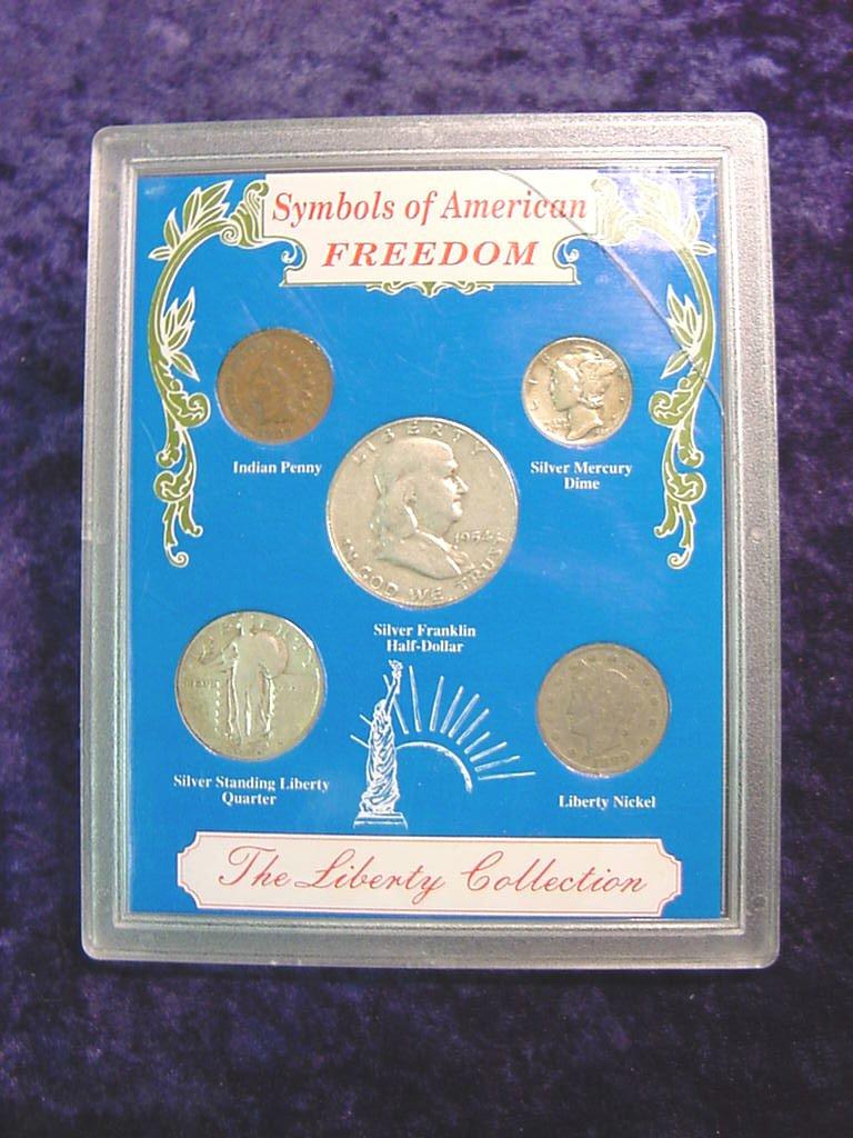 Symbols of American Freedom Set. Indian Cent" Liberty Nickel Mercury Dime Standing Quarter and Franklin Half.