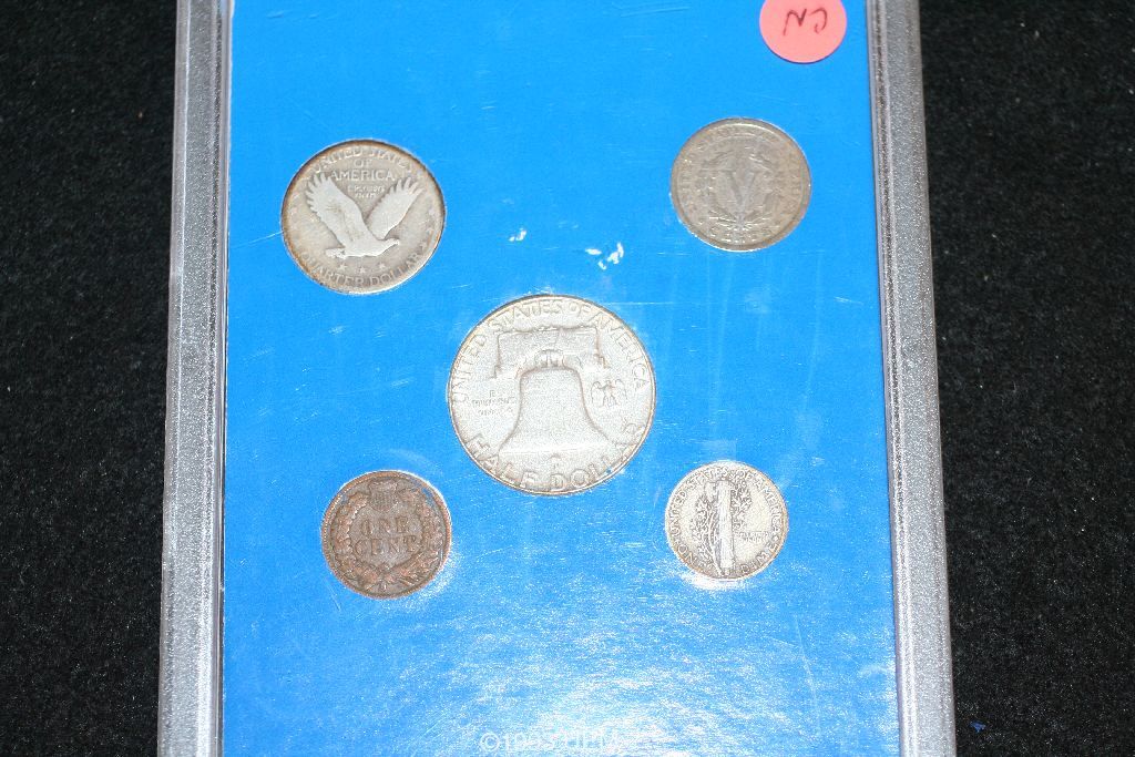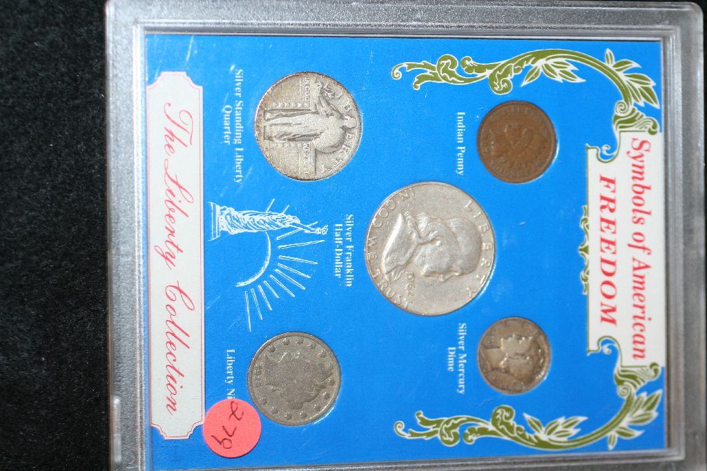 Symbols of American Freedom-The Liberty Coin Collection; Indian Head One Cent, Liberty V-Nickel, Silver Mercury Dime, Silver Standing Liberty Quarter & Silver Ben Franklin Half Dollar; Lot of 5