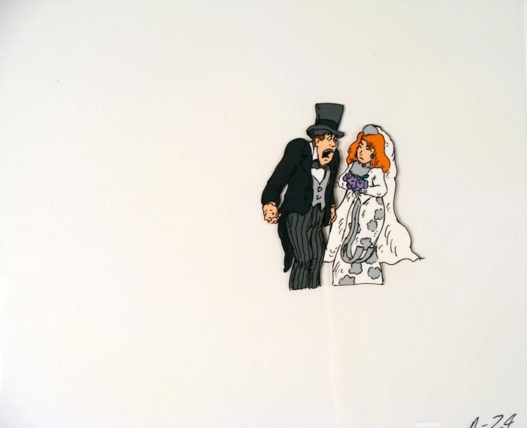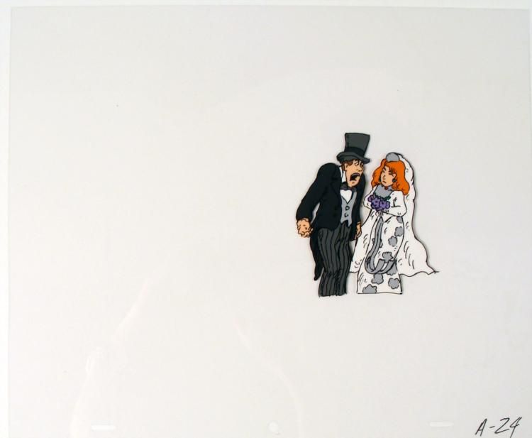 This is an original animation cel of a bride and groom. * * * * Poor bride... It looks like the groom is just unloading on her... * * * Medium: Hand painted acetate cel * * Cel size: 10 1/2" x 12 1/2" * * Notations: Bottom of cel * * Condition: Excellent