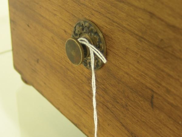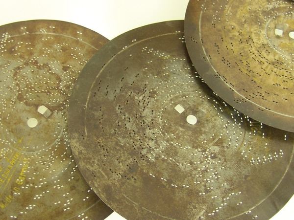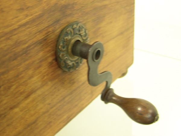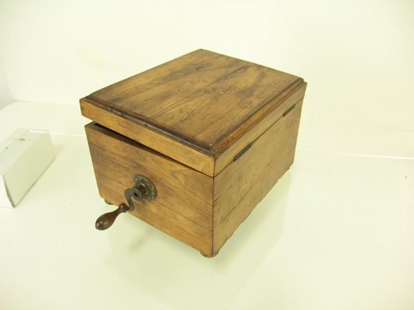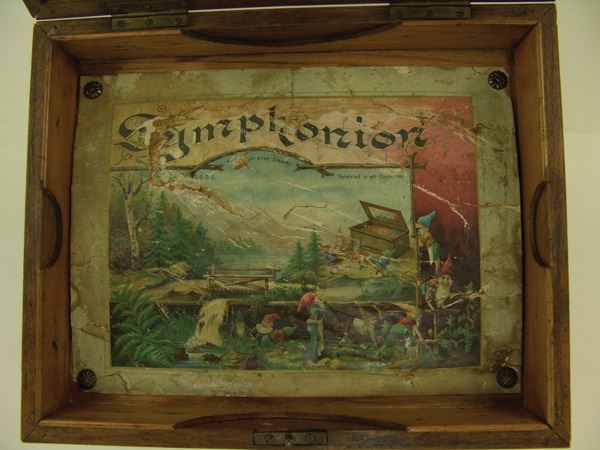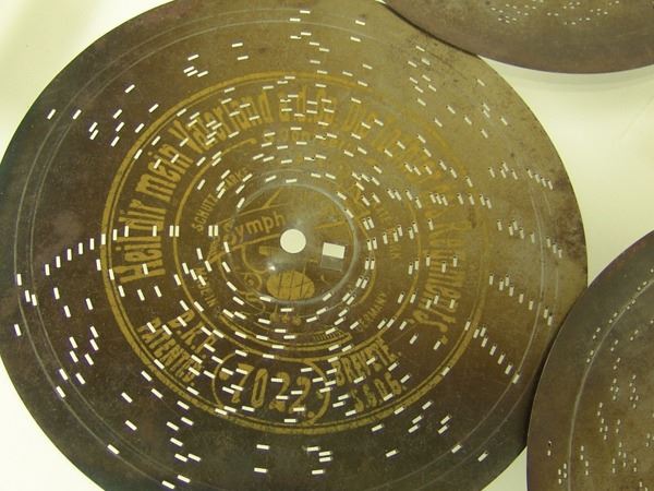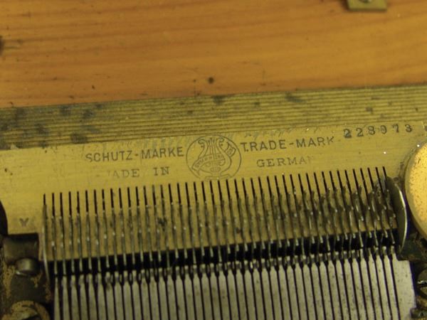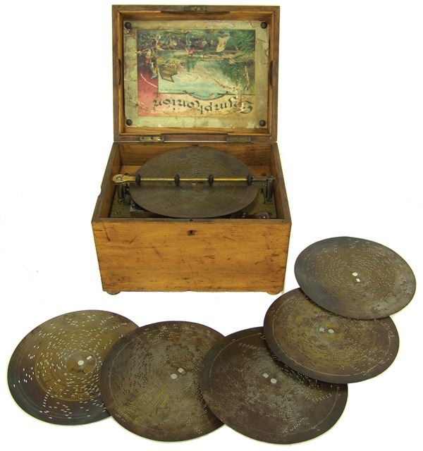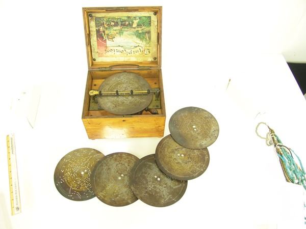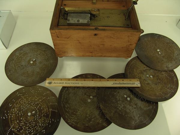 Famous Schutz-Marke medal disk music box in wooden case. Good, working condition. Includes handle/crank, plus six, original disks, #7011,7311,7192,7183,7022, and 7085 - all play beautifully!Late 1800s7" x 10-1/2 x 8