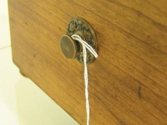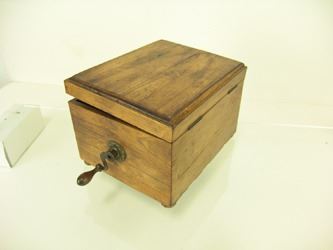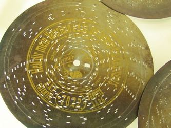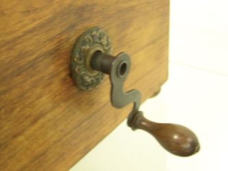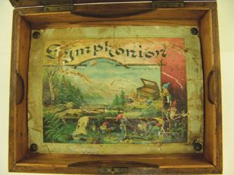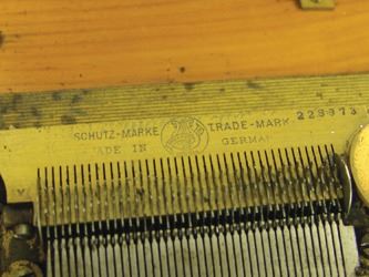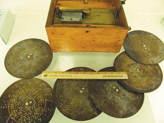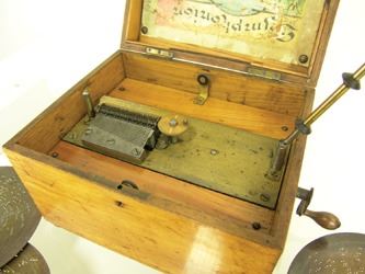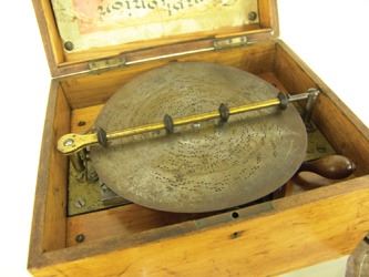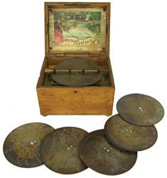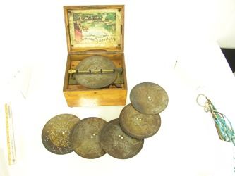 Famou, Schutz-Marke medal disk music box in wooden case. Good, working condition. Includes handle/crank, plus six, original disks, #7011,7311,7192,7183,7022, and 7085 - all play beautifully! Late 1800s. 7" x 10-1/2" x 8"