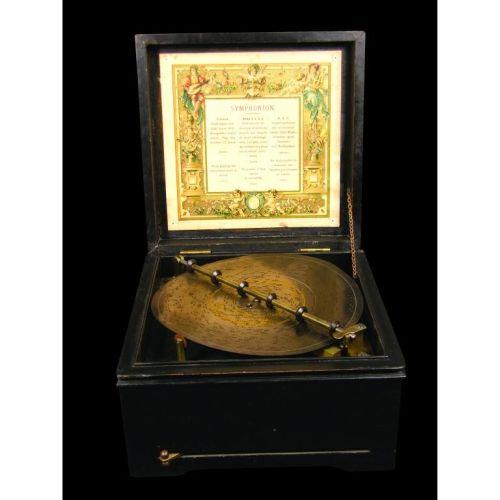 Symphonion Music Box, Some paint missing from the top otherwise Excellent Working Condition, Comes with one disc, 11 1/2 x 6 1/2 x 11 1/2 inches closed.