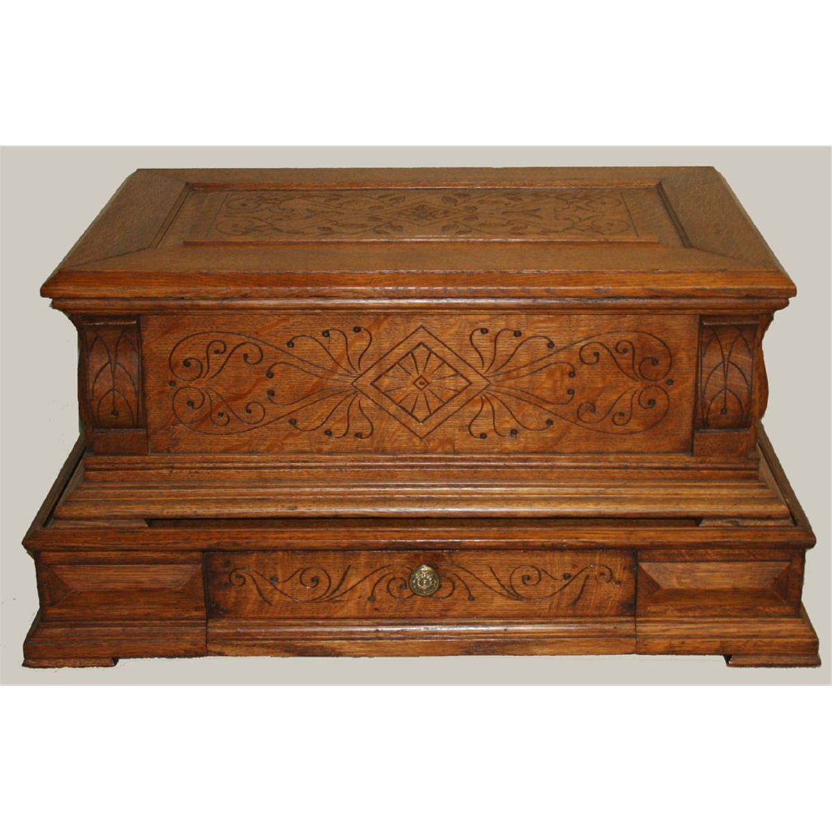 Symphonion Musical Box in lovely, decorative, carved oak case with storage unit beneath containing nine 12" discs. Double comb. No broken teeth. Working condition.