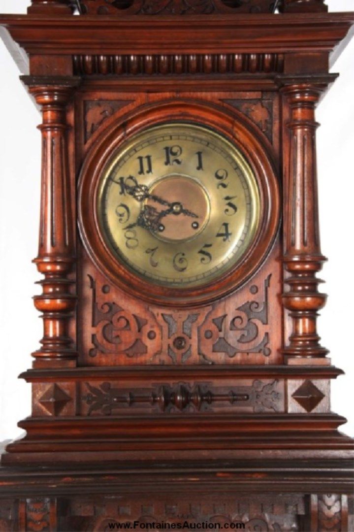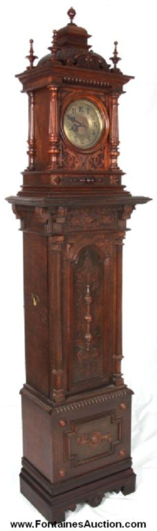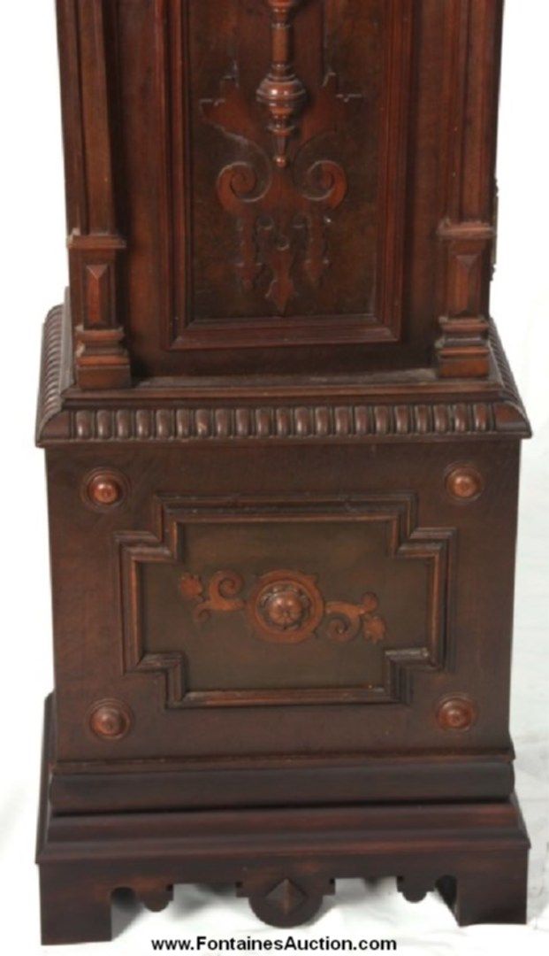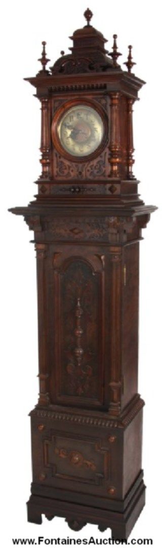 Symphonion Musical Grandfather Clock. Style No. 30-St, a tall walnut case with turned finials at the top carved crest and turned columns on the bonnet door, the case body has applied carved panels, pilasters on the door and crank on the right side. Brass 9 in. dial has incised hour numbers and fancy pierced hands, brass spring driven 14 day movement signed Lenzkirch (943224), has an hour strike on a coiled gong and plays a disc music box on the hour. The music box is built in the body of the case, spring driven with gold painted iron bedplate, duplex combs arranged in a "Sublime Harmonie Style", in good working condition, has night time on/off switch and speed regulator lever on the left side; 2 shelf disc rack inside of the case below the mechanism. In excellent condition and original finish, music box has crank, timepiece has pendulum, has 26 discs measuring 13 5/8 in. Case measures 92.5 in. high x 23 in. wide x 14.5 in. deep.
