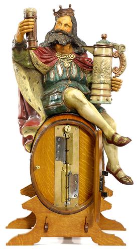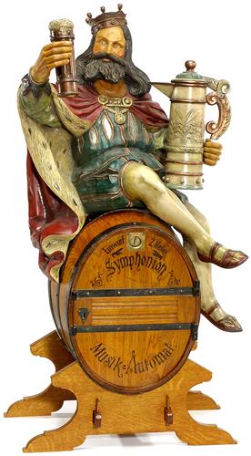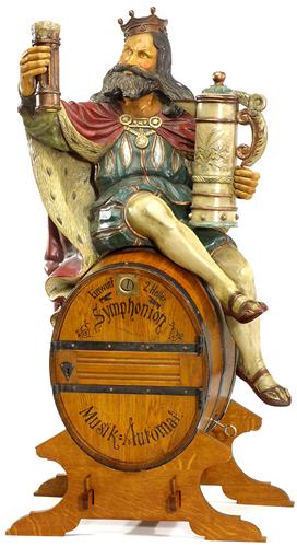 Symphonion No. 25 GS: "Gambrinus" Spectacular original coin-operated disc musical box by "Symphonion Musikwerke, Leipzig", for 11 3/4 in. discs, 84 teeth in duplex comb (complete!!), with a wonderful wood-carved figure of the mythical Flemish King "Gambrinus". 43 1/2 in. high. With 10 discs. - An excellent replica. - Great playing instrument and spectacular collector's item and exhibition piece!<Br>