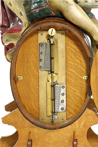 Symphonion No. 25 GS: "Gambrinus" Spektakulärer Münzautomat der "Symphonion Musikwerke, Leipzig", mit Original-Plattenspielwerk für 30-cm-Platten, 84-toniger Doppelkamm (komplett!!), gekrönt mit einer exzellent geschnitzten Holzfigur des mythischen flämischen Königs "Gambrinus". Eine hervorragende Replika. Gesamthöhe: 110 cm. Mit 10 Platten. - Exzellent spielendes Instrument und spektakuläres Sammlungs- und Ausstellungsstück!