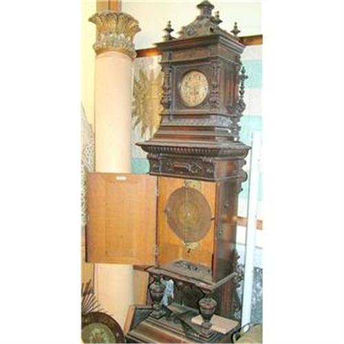 A fantastic large Hallclock with music box, made by Symphonion Germany close to 1900, double comb in original conditions ,tall case measuring 89 inches H ( 2.26 mt), 23 inches wide ( 60 cmt) and 14 inches D ( 36 cmt), comb in good conditions without any repairs, 12 inches disk ( 30 cmts), single existing disk is damaged. This piece is in UNRESTORED conditions, the clock with the original pendulum and key, is working as well as the Music box, the case is damaged , and we sell this piece as it is, knowing the real market worth for a similar piece in good conditions is over $20.000 , we expect an expert to buy it for restoration purposes.