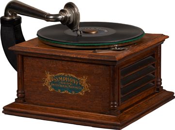 Symphony Wood Tabletop Phonograph Record Player On Oak Base w/Vents, Includes United Record “The Big Shawl” Duet By Stanley And Barr, c1910s, United Talking Machine Co. Chicago, ILL.