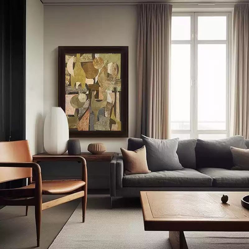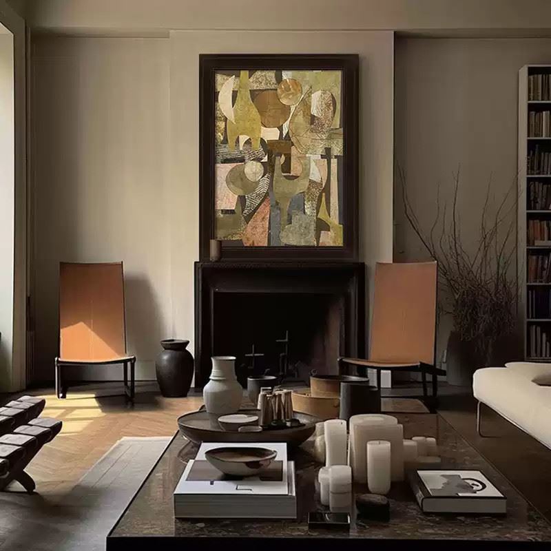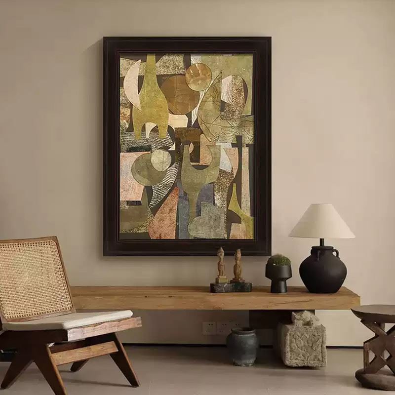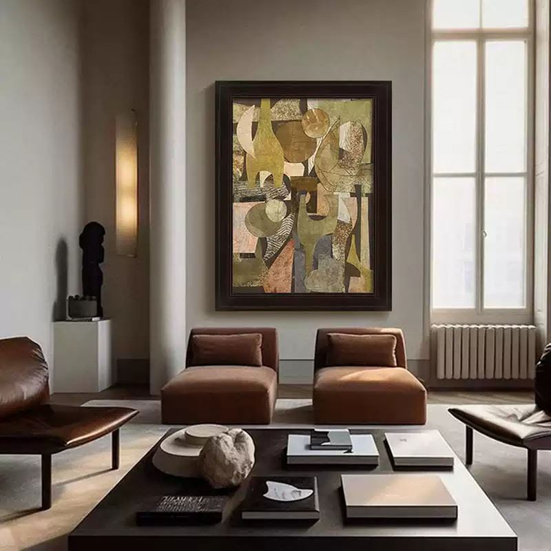 This artwork weaves together various geometric shapes and warm tones to create a sense of visual depth. The abstract layout and harmonious color pairing highlight the unique dialogue between form and space. Dimensions: 24 x 31 inches.