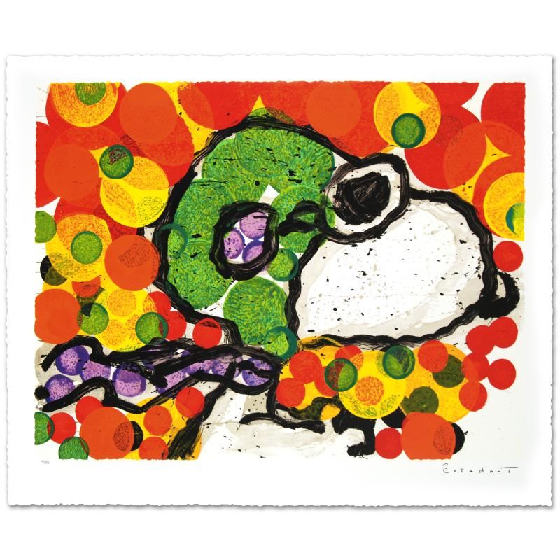 Master Artist Tom Everhart is the protege of famed "Peanuts" creator, Charles M. Schulz (1922â€"2000). As the only artist in the world granted the rights to draw the "Peanuts" characters in his own work, Everhart creates vibrant, extremely collectible rainbow masterpieces featuring Snoopy, Woodstock and the gang. "Synchronize My Boogie - Afternoon" is a limited edition hand pulled original lithograph on museum quality deckle-edge paper, numbered and hand signed by Everhart! Includes certificate of authenticity! Measures approx. 34" x 27.5" (with border); 30.5" x 23" (image). This artwork was created on one of two rare antique Marinoni Voirin lithograph presses that date back to the 1800's, and are reputed to come from the Paris print shop used by Henri Toulouse-Lautrec. There are only 7 of these magnificent beasts left in the world: the smaller one (with a print bed size of 25" x 35"), weighs 9 tons, and the larger one weighs in at 11 tons (print bed size 31" x 47"). The significance of this is that the lithographs produced by this method are of the finest quality, using techniques that are so labor and time intensive that very few master printers know how to operate and care for these presses today. Each lithograph is created with hand-mixed colors applied one at a time - a highly trained and synchronized team must hand feed each museum-quality sheet of paper through the press numerous times in order to set the colors and impressions, while the Chromist - a trained color specialist - adjusts each color by look and feel to match the original artwork, as if mixing a potion. The result is an image with maximum pigment saturation, formed through rich layers of color that imbue the artwork with a permanency of brilliance - proven over centuries to last. In contrast, today's printers use a method more akin to a dot matrix style application, with the colors all premixed and sprayed onto a sheet in a uniform layer, resulting in a much less saturated image that is susceptible to fading and imperfect color reproduction. This is one of the final Tom Everhart editions to be printed using this very special technique.