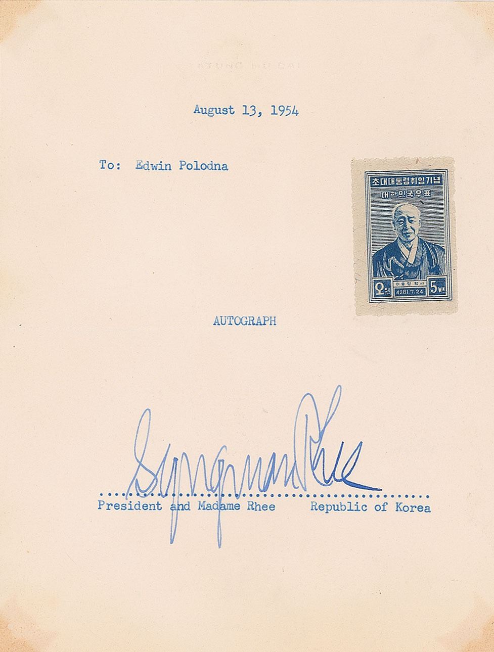 Fountain pen signature, "Syngman Rhee,” on an off-white 5.75 x 7.75 sheet of blindstamped Kyung Mu Dai letterhead, dated August 13, 1954, and bearing a typed inscription to Edwin Polodna. A stamp depicting Rhee is affixed at the top. In fine condition, with toning to corners.