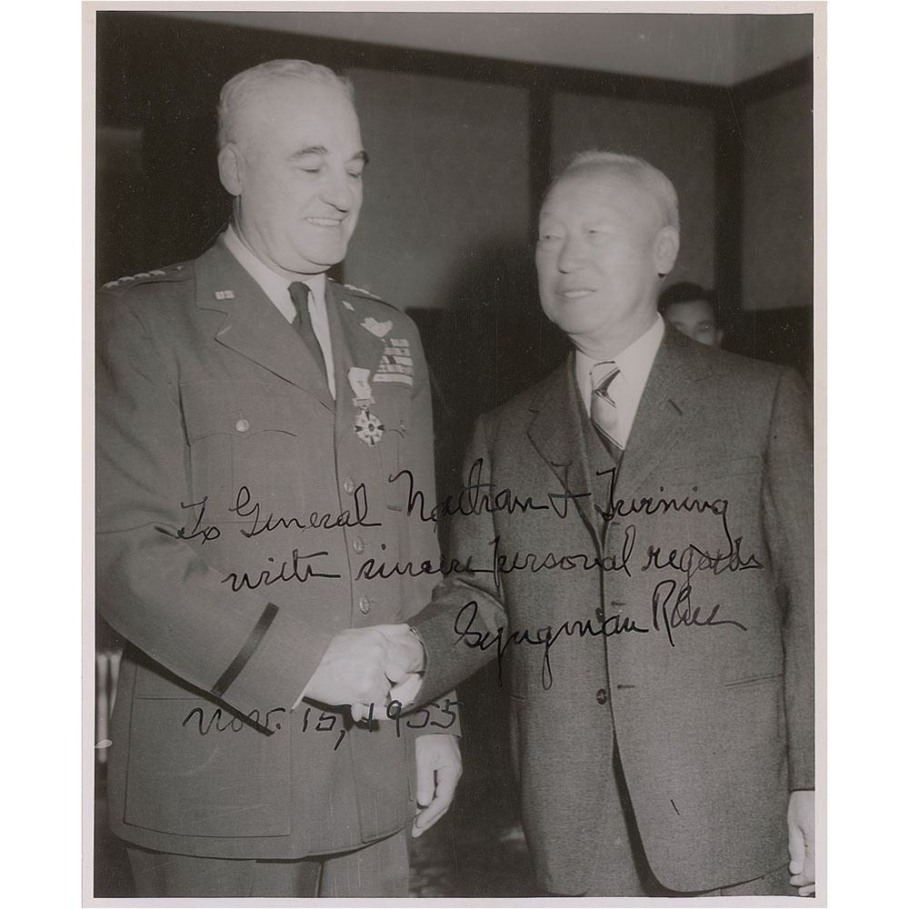 Uncommon glossy 8 x 10 official Korean Air Force photo of Rhee greeting General Nathan Twining, boldly signed and inscribed in fountain pen, "To General Nathan F. Twining, with sincere personal regards, Syngman Rhee, Nov. 15, 1955." Reverse bears a Korean Air Force ink stamp. In fine condition, with scattered light creasing. General Twining played a major role in mobilizing the Air Force after war broke out in Korea, and was a key figure in forming United States policy in Indochina.