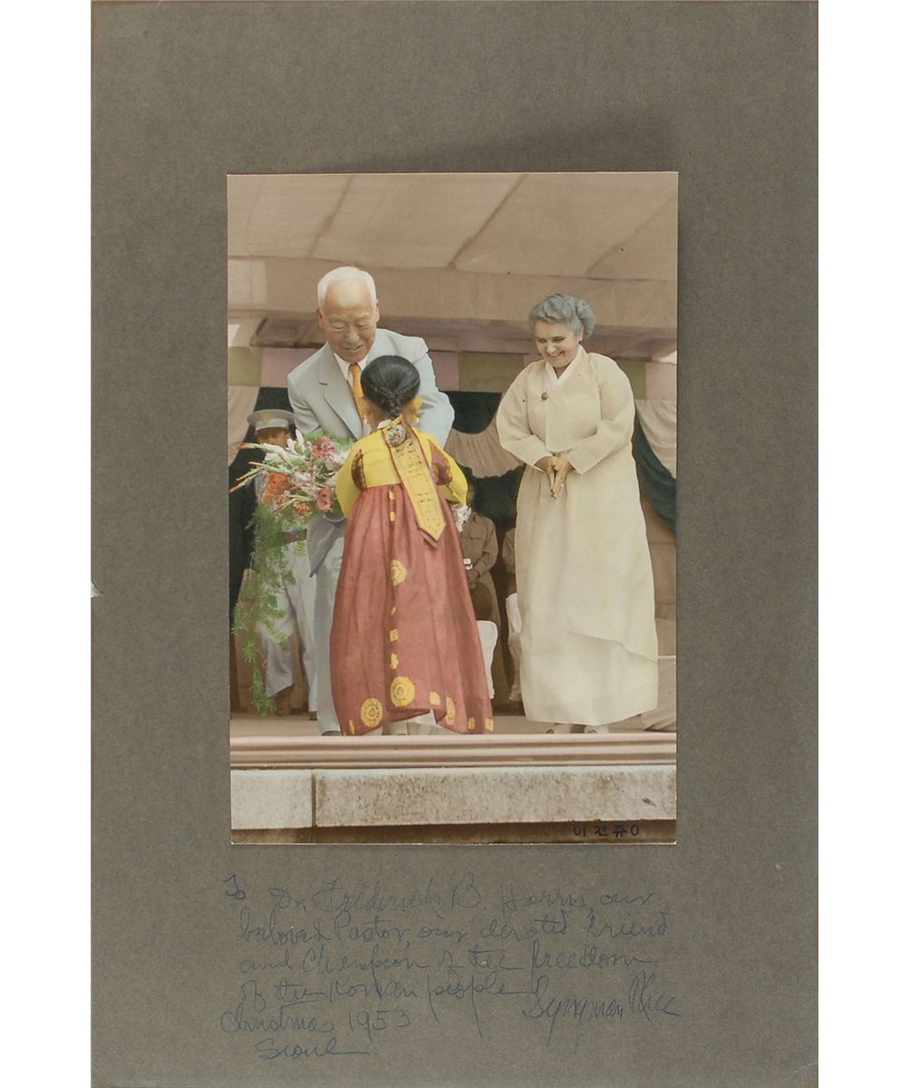First President of South Korea (1875–1965) from 1948 until his resignation in 1960. Color 6.5 x 9.75 photo of Rhee and his wife receiving flowers from a young girl, affixed to a 10.75 x 16 mount, signed and inscribed on the mount in blue ink, “To Dr. Frederick B. Harris, our beloved Pastor, our devoted friend and champion of the freedom of the Korean people. Syngman Rhee, Christmas 1953 Seoul.” In fine condition. Reverend Harris helped organize the Korean congregation at the historic Foundry United Methodist Church of Washington, DC.