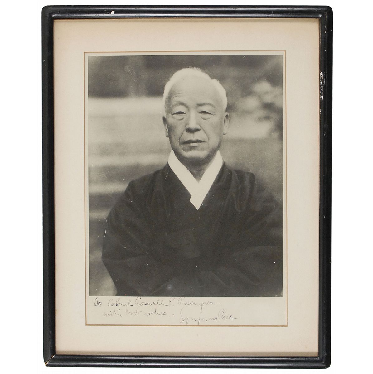 First President of South Korea (1875–1965) from 1948 until his resignation in 1960. Rare matte-finish 8.25 x 11 photo of Rhee wearing a traditional Korean robe, signed and inscribed in the lower border in fountain pen, “To Colonel Roswell P. Rosengren, with best wishes, Syngman Rhee.” Matted and framed to an overall size of 12 x 15. In fine condition, with noticeable irregular ink adhesion.