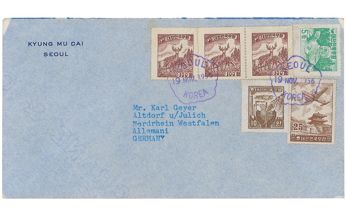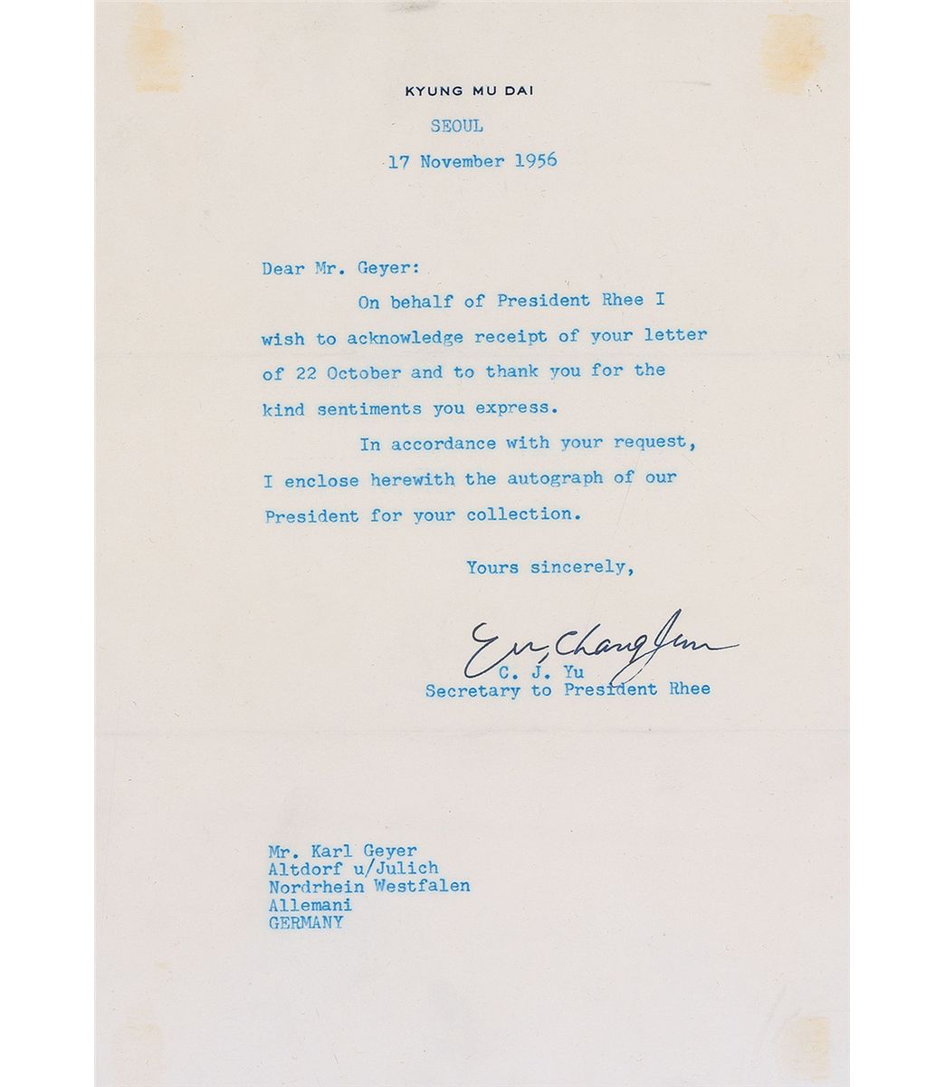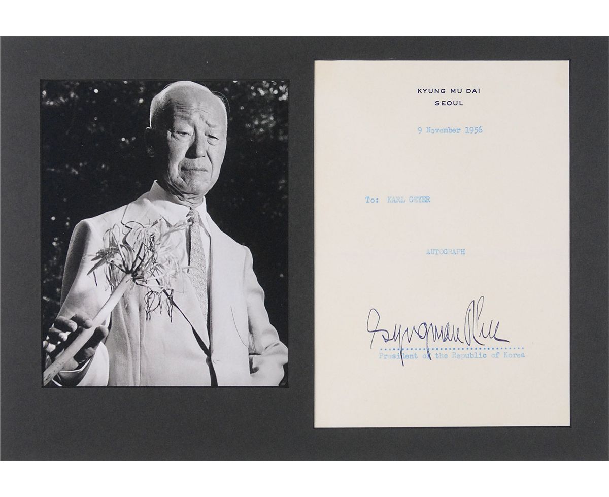 First President of South Korea (1875–1965) from 1948 until his resignation in 1960. Fountain pen signature, “Syngman Rhee,” on an off-white 5 x 7 sheet of Kyung Mu Dai letterhead. Matted with an unsigned photo to an overall size of 11.75 x 8.25. In fine condition. Accompanied by the original mailing envelope and transmittal letter from his office, dated November 17, 1956.