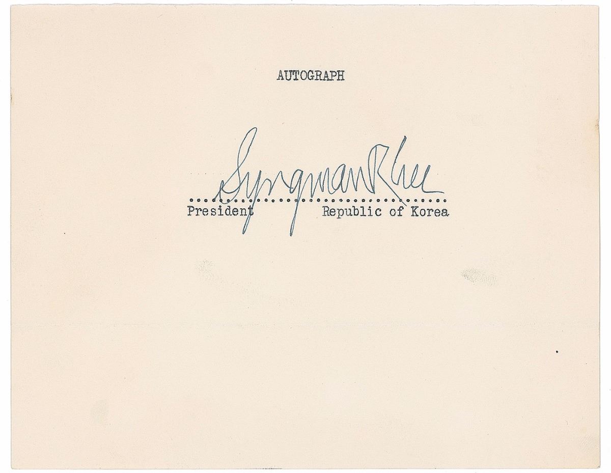 First president of South Korea (1875–1965) from 1948 until his resignation in 1960. Fountain pen signature, “Syngman Rhee,” on an off-white 6.5 x 5 sheet. In fine condition.