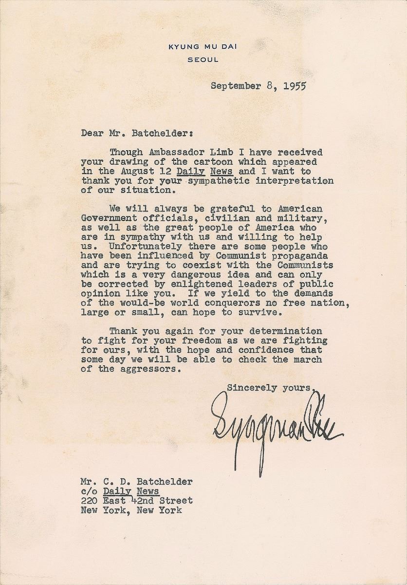 TLS, one page, 7.25 x 10.25, Kyung Mu Dai letterhead, September 8, 1955. Letter to C. D. Batchelder of the Daly News, in part: “I have received your drawing of the cartoon which appeared in the August 12 Daily News and I want to thank you for your sympathetic interpretation of our situation. We will always be grateful to American Government officials, civilian and military, as well as the great people of America who are in sympathy with us and willing to help us. Unfortunately there are some people who have been influenced by Communist propaganda and are trying to coexist with the Communists which is a very dangerous idea and can only be corrected by enlightened leaders of public opinion like you. If we yield to the demands of the would-be world conquerors no free nation, large or small, can hope to survive.” In very good to fine condition, with scattered light toning and soiling.
