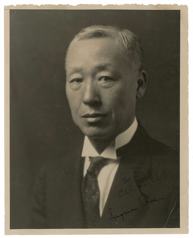 First President of South Korea (1875–1965) from 1948 until his resignation in 1960. Handsome vintage glossy 8 x 10 portrait of Rhee in a dignified close-up pose, signed and inscribed in fountain pen, "To the Campus Club, Syngman Rhee.” In fine condition, with light chipping along the top edge, and scattered light creasing.