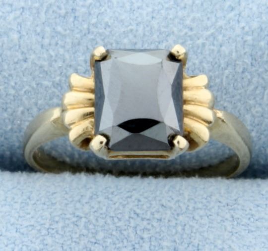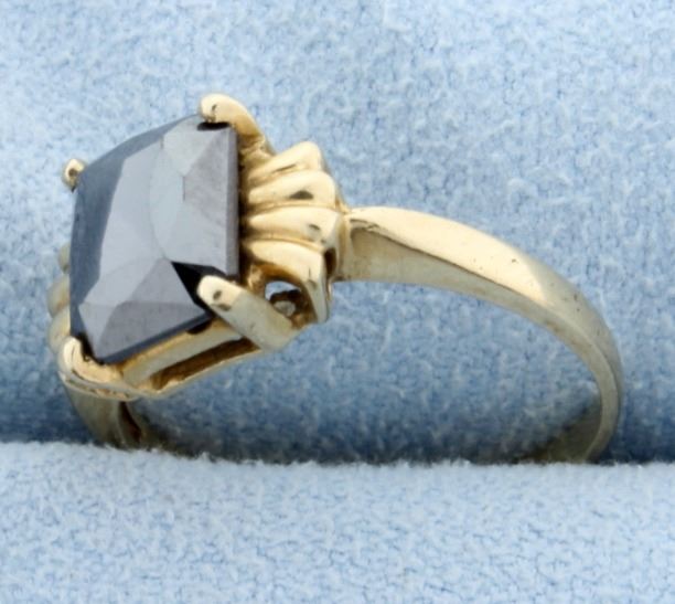 In 10K yellow gold, the ring has a 8x6.5mm synthetic black sapphire. Size 5 1/2     2.2g