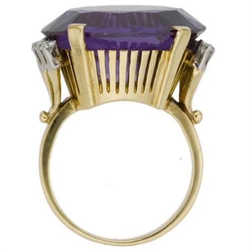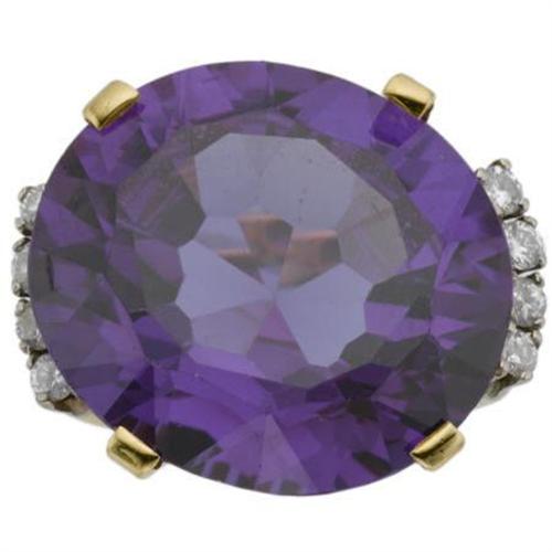 <B>Synthetic Color Change Sapphire, Diamond, Gold Ring</B></I> The ring features an oval-shaped synthetic color change sapphire measuring 20.15 x 18.15 x 9.25 mm and weighing approximately 24.00 carats, enhanced by full-cut diamonds, set in 18k yellow gold with rhodium finished accents. Total diamond weight is approximately 0.30 carat. Gross weight 12.90 grams.<BR><I>*Note: Size 7 (sizeable)</B></I><BR><BR><b>Shipping:</b> Miscellaneous Collectibles, Larg (<a target="_blank" href="http://www.heritageauctions.com/common/shipping.php">view shipping information</a>)