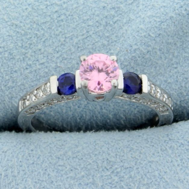 In 14k white gold this ring contains a 5mm round synthetic pink sapphire gemstone with two 3mm round synthetic blue sapphires. 1/4ct total weight. Size 6 1/2      3.3g