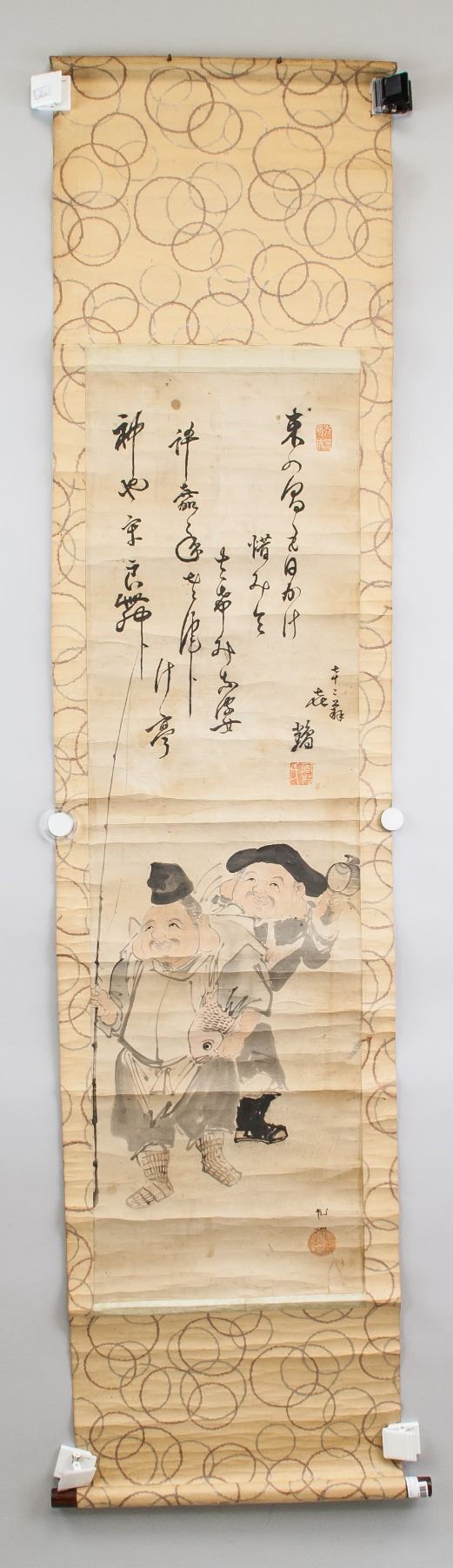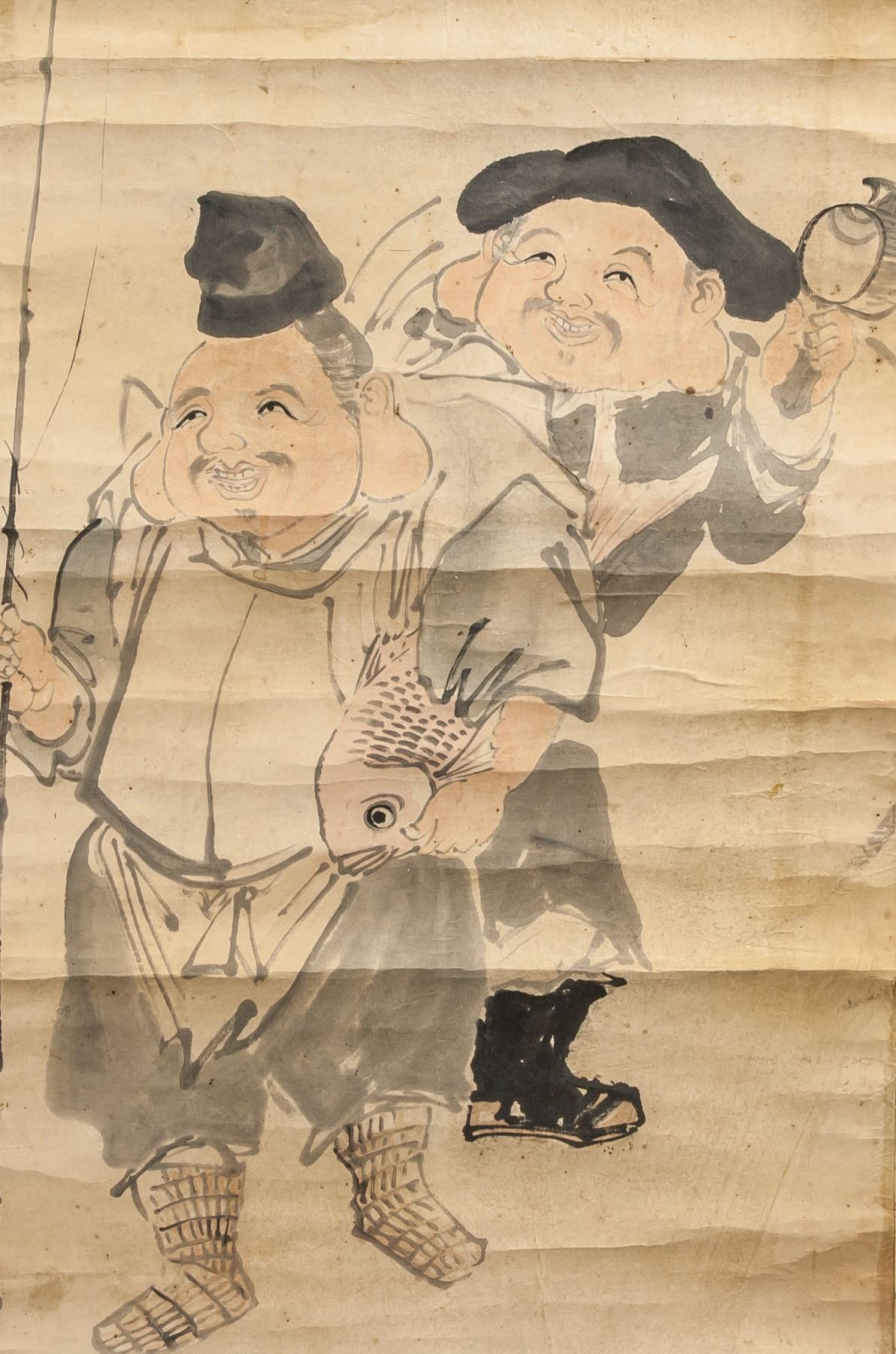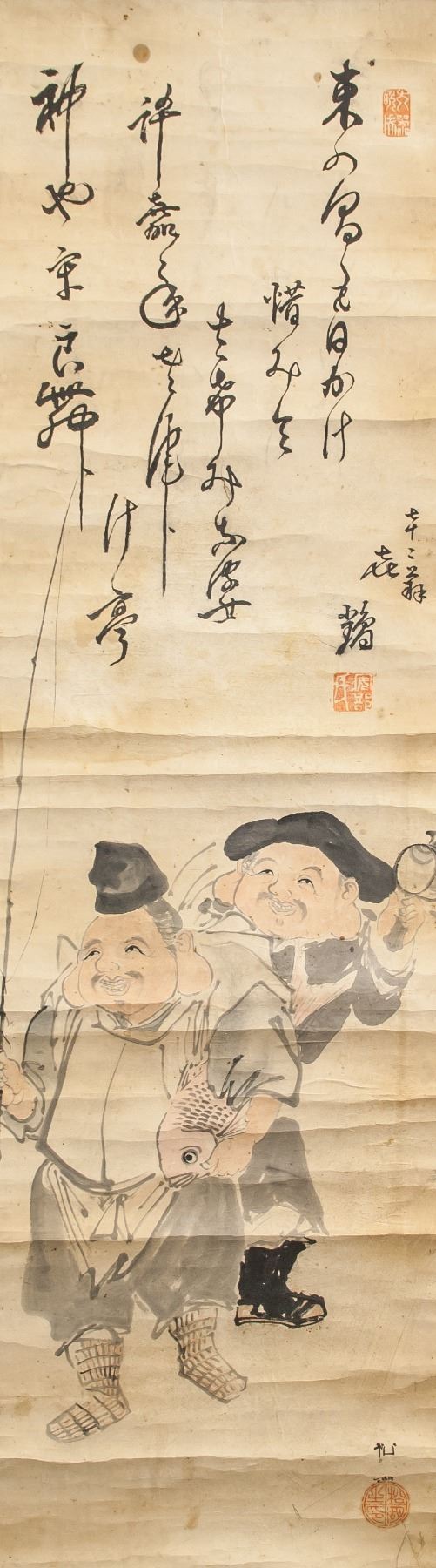 Two fishing men, ink and watercolor on paper, hanging scroll, signed Syouko, inscribed with 3 artist seals, 62 x 77 cm