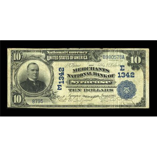 <B>Syracuse, NY</B></I> - $10 1902 Date Back Fr. 616 <B>The Merchants NB</B></I> Ch. # (E)1342<BR> Pleasing stamped signatures and a bold blue overprint are noted on this first title note. <B>Very Fine.</B></I><BR><BR><b>Shipping:</b> Coins & Currency (<a target="_blank" href="http://www.heritageauctions.com/common/shipping.php">view shipping information</a>)