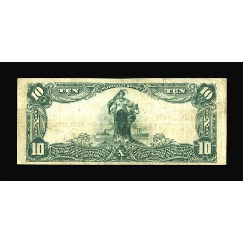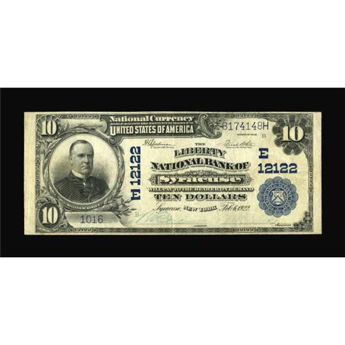 <B>Syracuse, NY </B></I>- $10 1902 Plain Back Fr. 635<B> The Liberty NB</B></I> Ch. # (E)12122<BR> Although this bank operated for seven years, it issued a minimal number of sheets, particularly for a "big city" bank. This is the only note known from the bank, and one which has never been offered at public sale to the numismatic community, having been obtained from another collector in a private transaction many years ago. Evenly circulated <B>Fine-Very Fine,</B></I> an item virtually impossible to estimate, because, once the hammer falls this evening, where could another be obtained at any price? <BR><I>From The Thomas A. Bergin Collection</B></I><BR><BR><b>Shipping:</b> Coins & Currency (<a target="_blank" href="http://www.heritageauctions.com/common/shipping.php">view shipping information</a>)