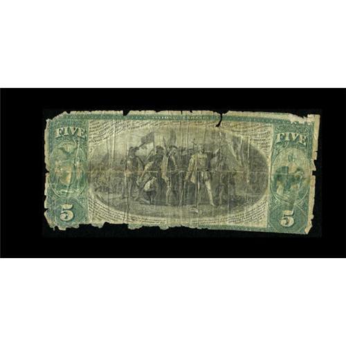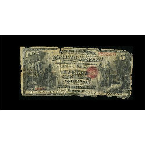 <B>Syracuse, NY</B></I> - $5 Original Fr. 394 <B>The First NB</B></I> Ch. # 6<BR> This newly discovered note is one of only two Original Series notes known from this very scarce low charter bank. <B>Good, </B></I>with some splits and missing pieces in the margins, but rare enough to see a winning bid in the range of...<BR><BR><b>Shipping:</b> Coins & Currency (<a target="_blank" href="http://www.heritageauctions.com/common/shipping.php">view shipping information</a>)