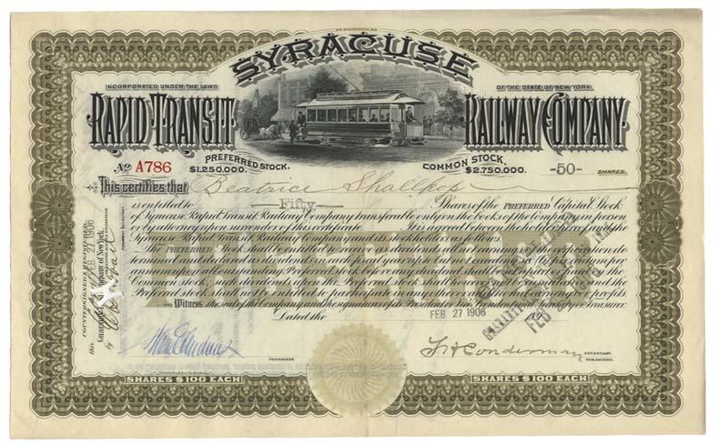 1906, New York. Stock certificate for 50 shares. Olive/Black. Vignette of early streetcar at top center. Stamp and punch cancelled. Very fine.