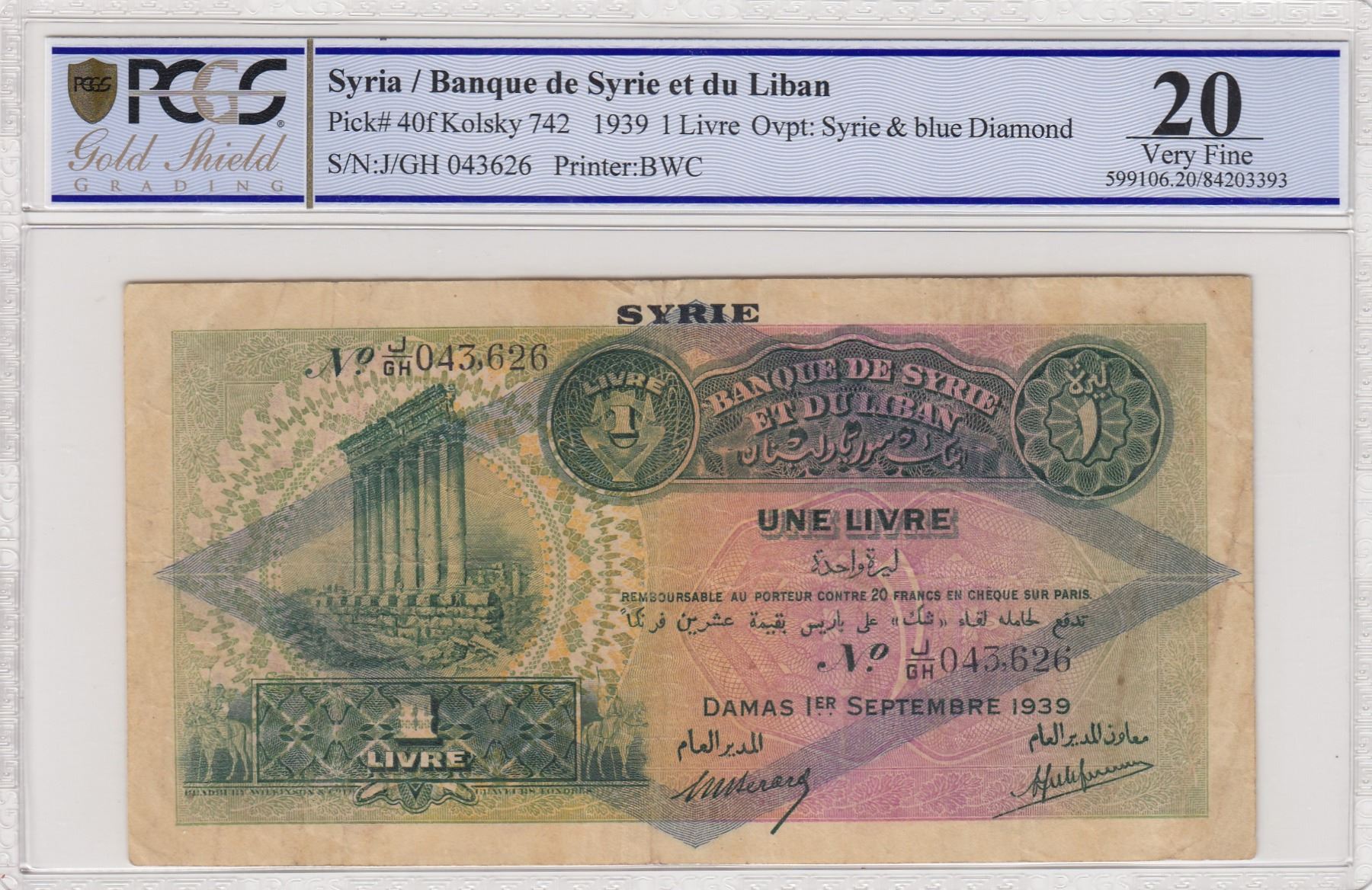 Syria, 1 Livre, 1939, VF, p40fbr/PCGS 20, serial number: J/GH 043626