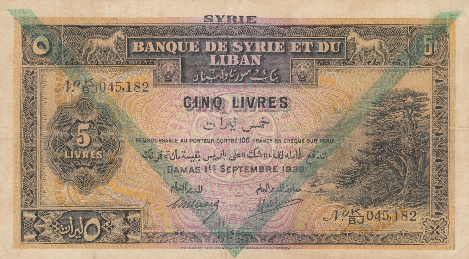 Syria, 5 Livres, 1939, VF, p41br/serial number: K/BJ 045182
