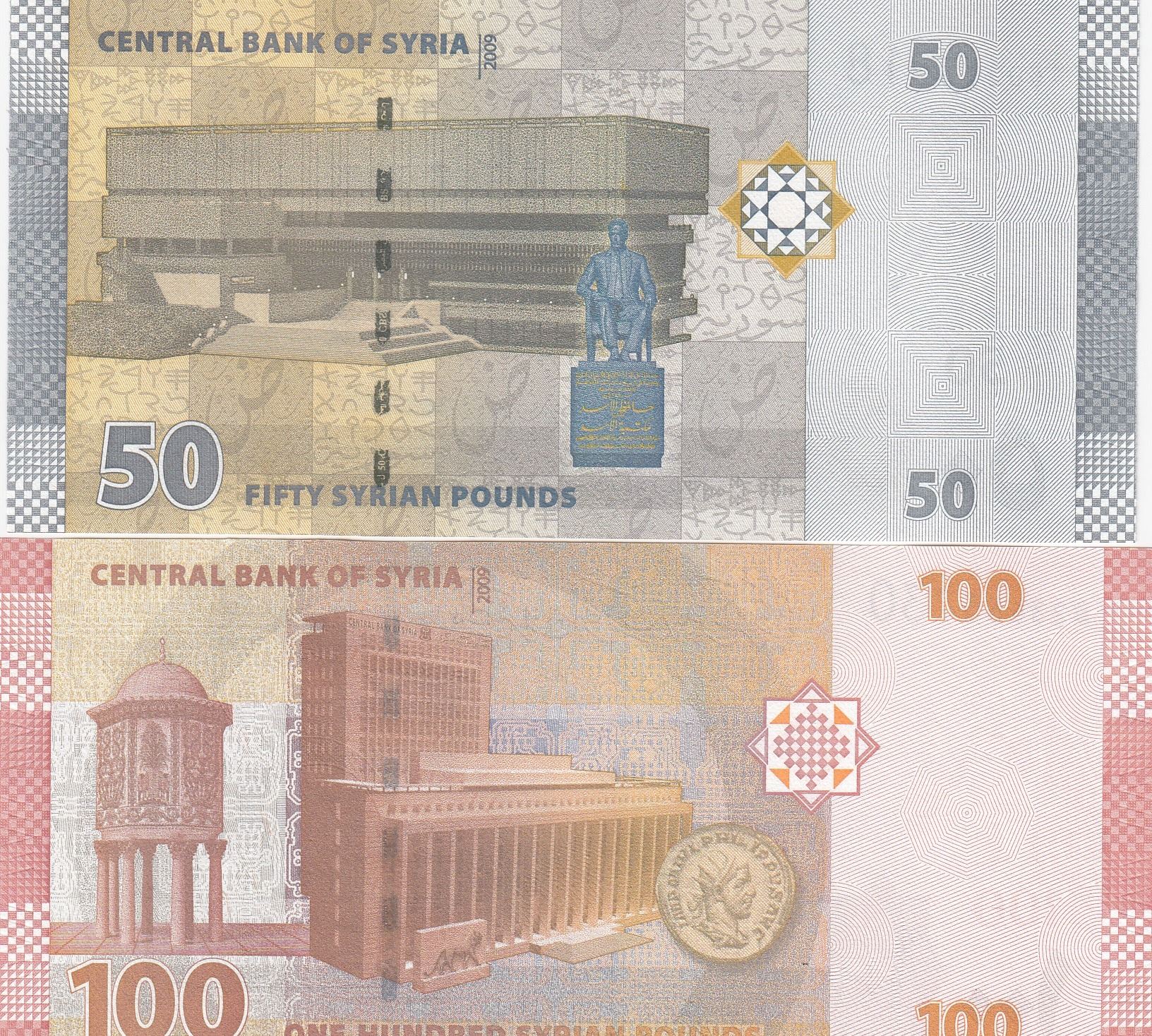 Syria, 50 Pounds and 100 Pounds, 2009, UNC, p112, p113, (Total 2 banknotes)br/serial numbers: A5 0215918 and B2 3655730