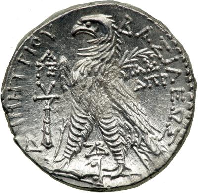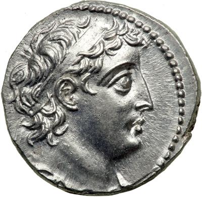 Demetrios II proclaimed Tyre as "holy and inviolable," as abbreviated in monogram form and seen above the club on the reverse.