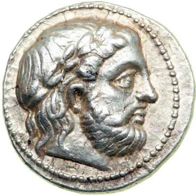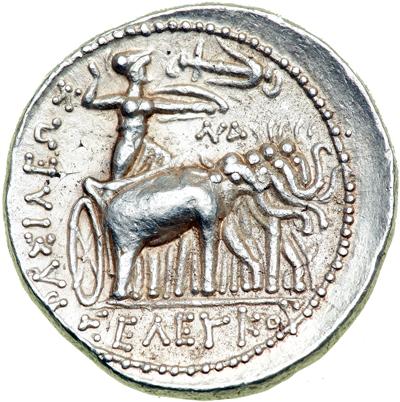 Syria. Seleukid Kingdom. Seleukos I, Nikator, 312-280 BC. AR Tetradrachm (17.1 g). Laureate head right of Zeus within dotted border. Reverse: Athena in quadriga of horned elephants right, brandishing spear and shield; in field, "N delta"; above, anchor (Seleukid symbol). Newell (ESM) 41; cf. SC-177(5); S-6856. Boldly struck on a huge flan of excellent metal. An absolutely fantastic example of this rare type. Superb Extremely Fine.