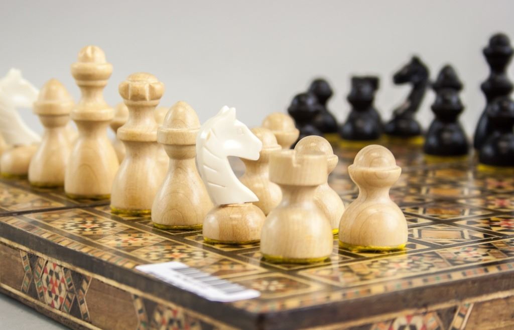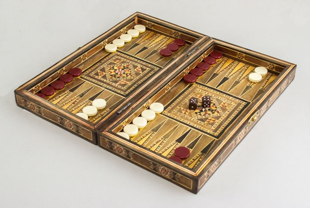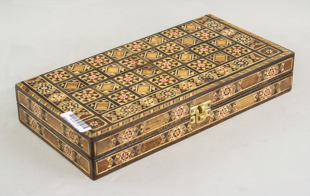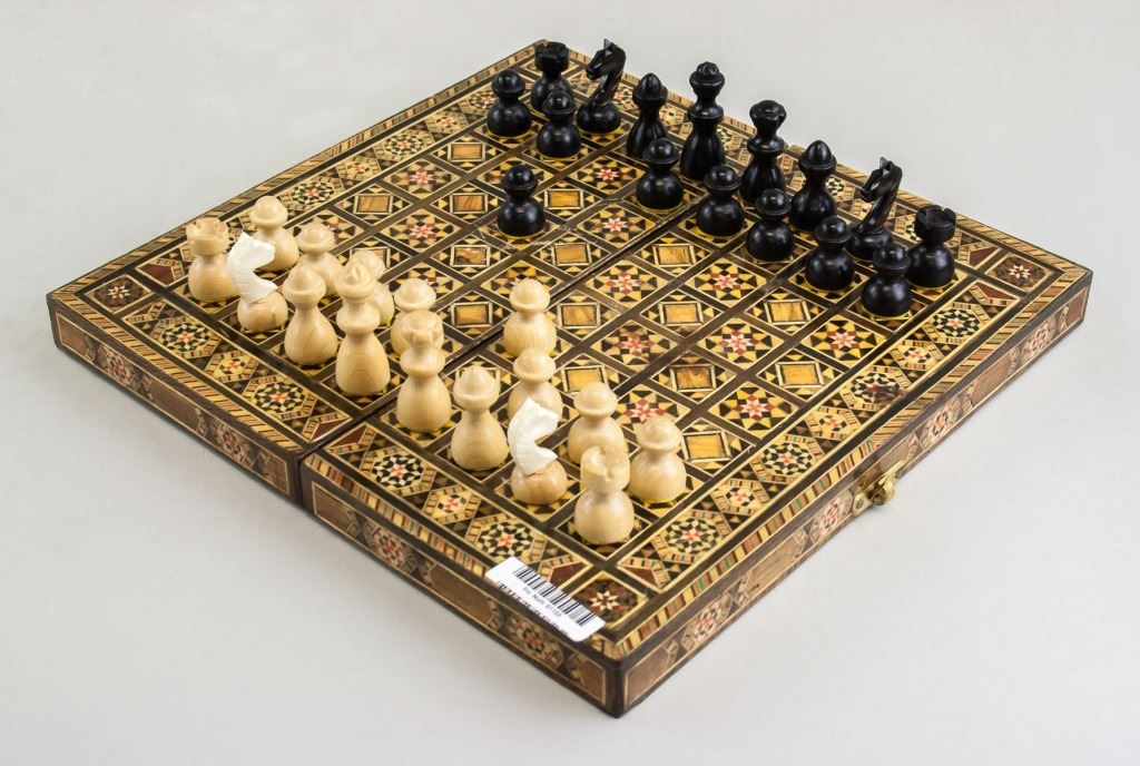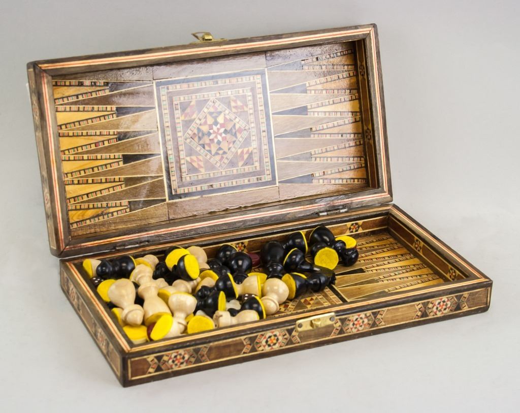 Syrian chess set and backgammon set, with wooden pieces and carrying case. 29 x 15 cm, 748 grams.