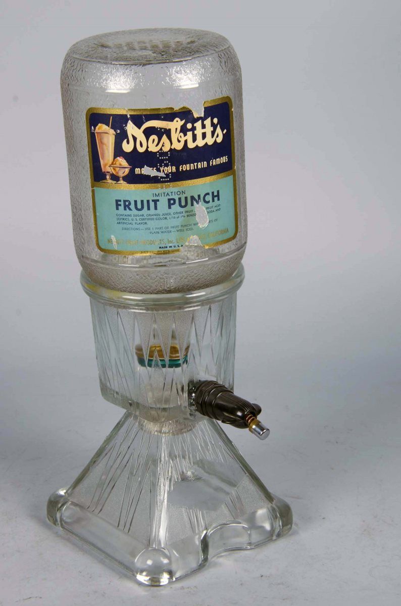 Glass syrup dispenser with decorative stippled glass design and bottle of Nesbitt's Imitation Fruit Punch. Circa 1950s. Condition (Excellent). Size 18-1/4" x 7" x 7"