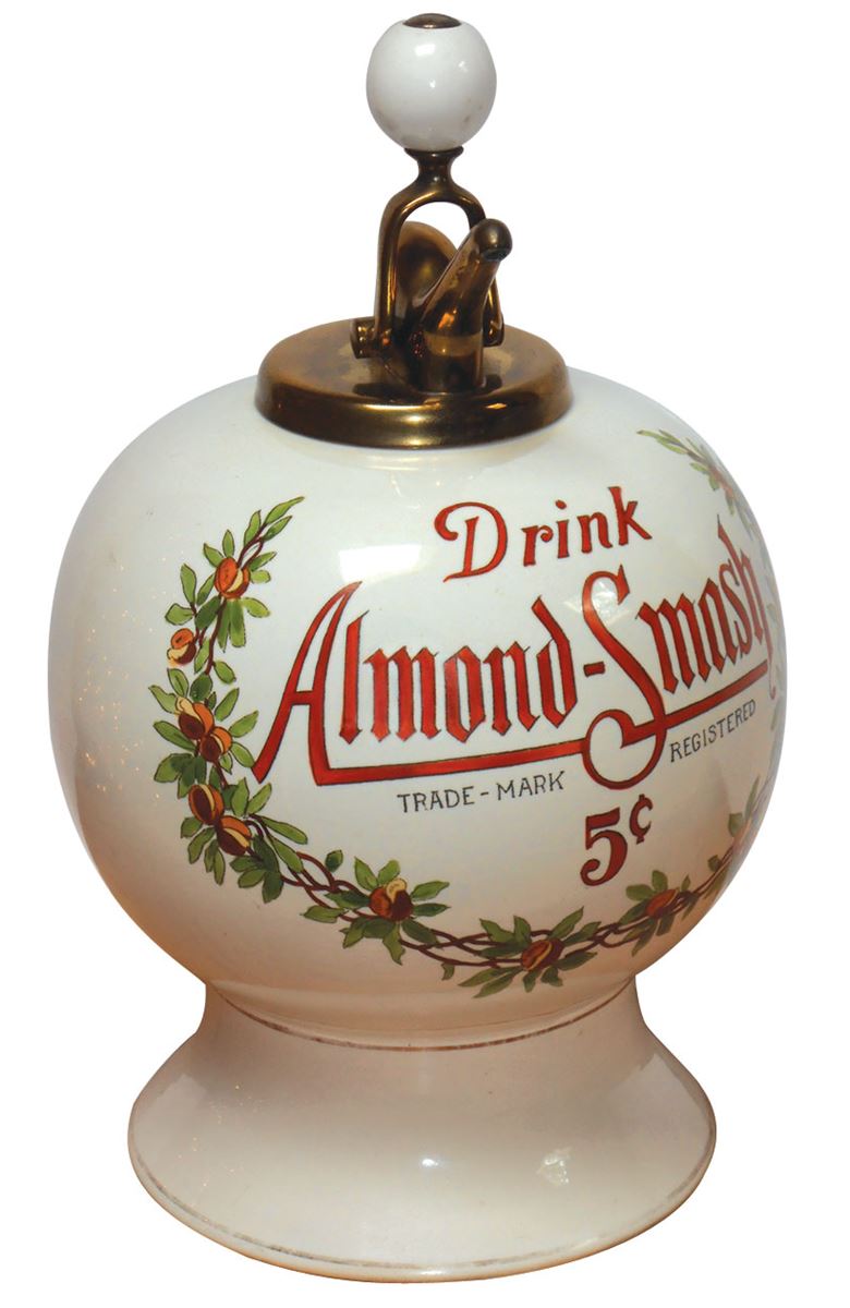 Syrup dispenser, Almond-Smash, bottom reads "Property of Almond-Smash Co.-Phila.", ceramic w/old ball-style pump, Exc orig cond, 16"H.