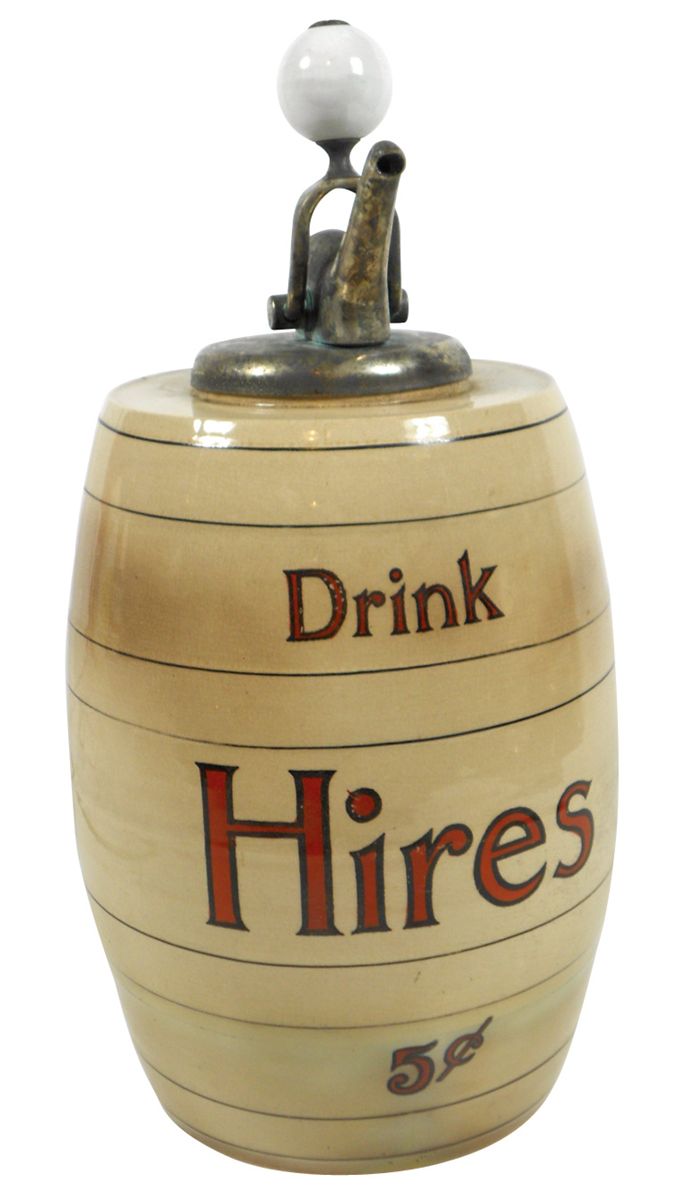 Syrup dispenser, Hires-5 Cents, barrel-shape w/ball-style replacement pump, dispenser is stained but