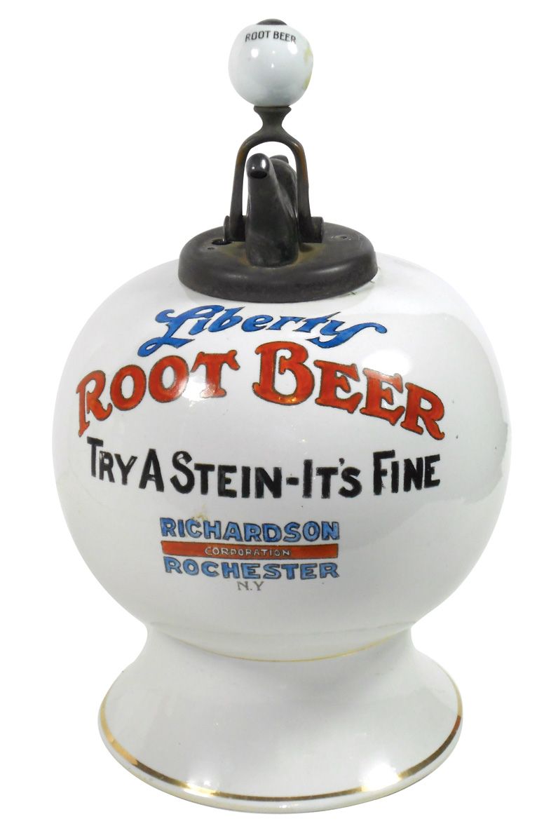 Syrup dispenser, Liberty Root Beer, "Try A Stein-It's Fine," mfgd by Richardson Corp.-Rochester, NY, ceramic ball-shape w/old "Root Beer" ball pump, dispenser in Exc cond, pump has 3 drilled holes in lid, 15.5"H.